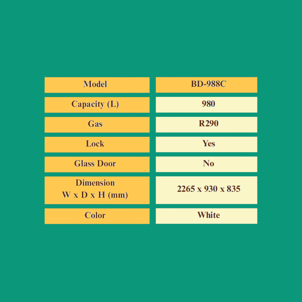 • Size: 2265mm x 930mm x 835mm • Features: Twin temperature (chiller & freezer), Direct cold system (Temp < -25°C), White inner coating, Equipped with door frame heater • Capacity: 980L • Color: White • Warranty: 1 Year General Warranty + 5 Years Compressor Warranty