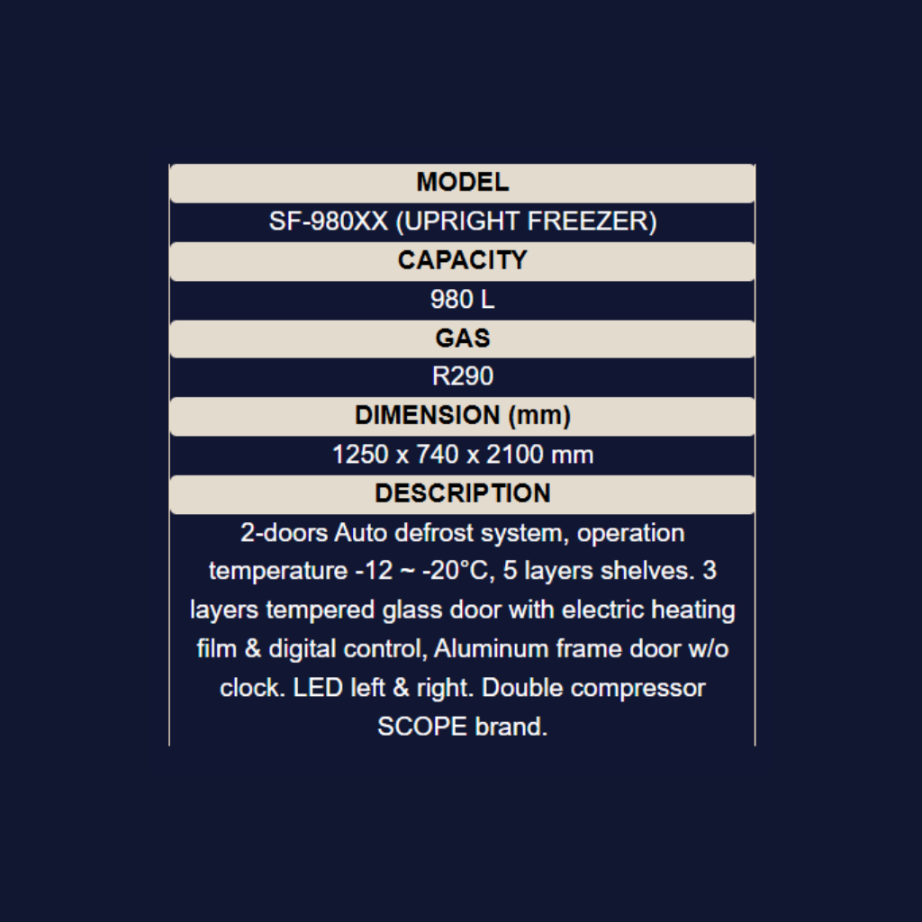 • Size: 1250mm x 740mm x 2100mm • Features: Auto defrost system, 3 layers tempered glass door with electric heating film, Digital thermostat, Upright Freezer & Chiller • Capacity: 980L • Color: Silver • Warranty: 1 Year General Warranty + 5 Years Compressor Warranty