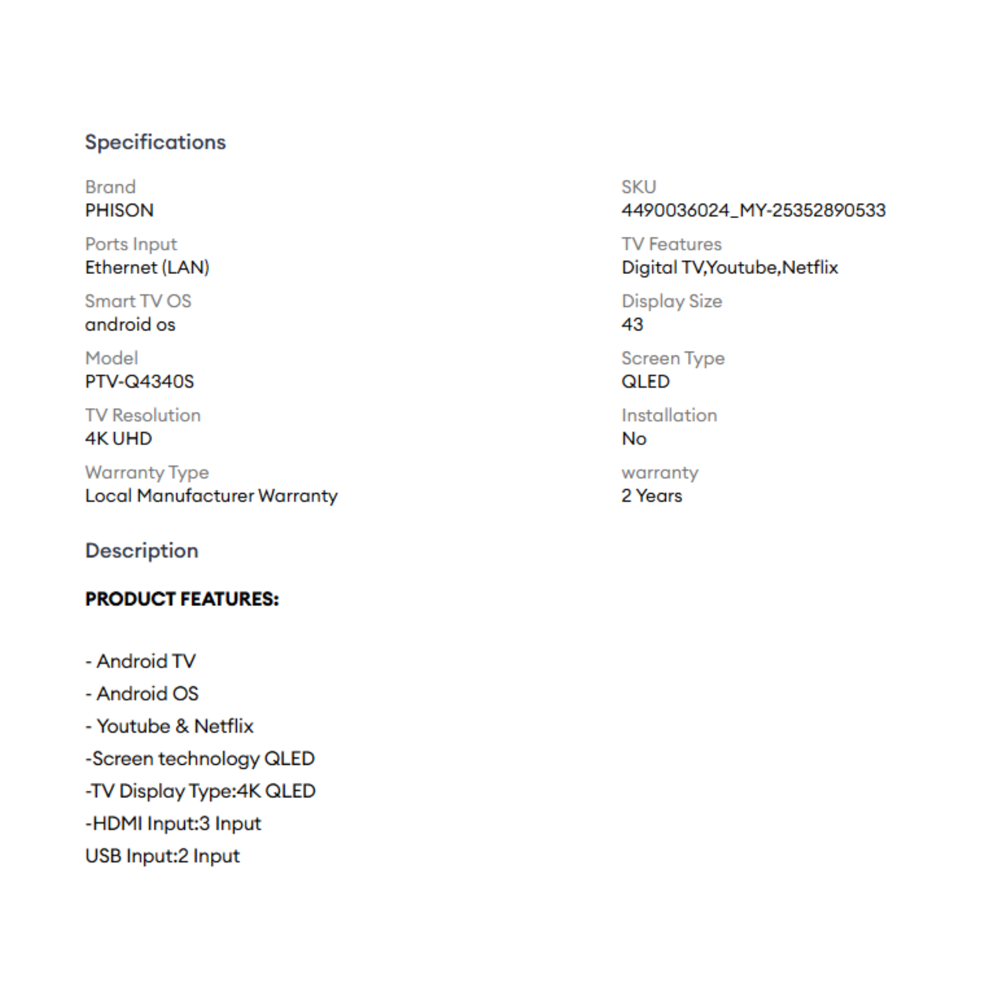Phison 43" FHD QLED TV PTV-Q4340S. Android smart features. 2-Year Warranty. Fast shipping.