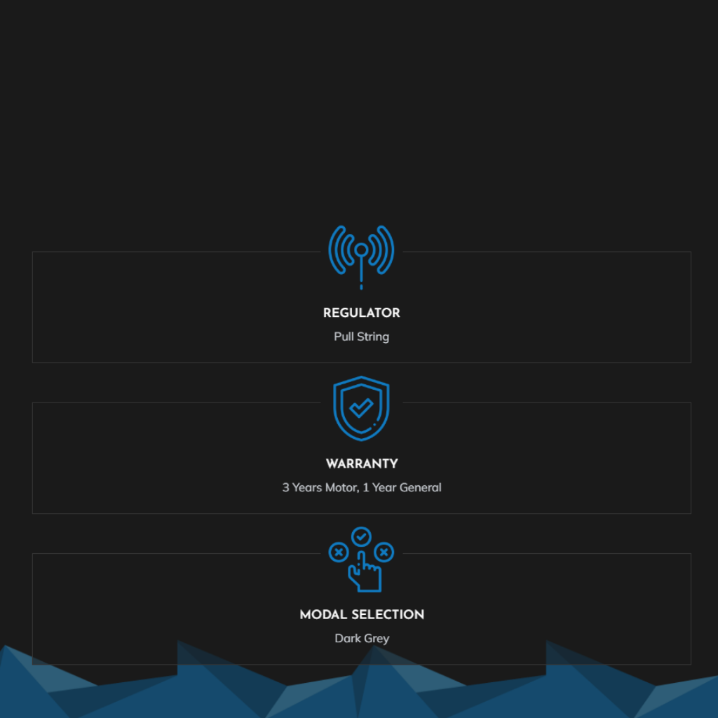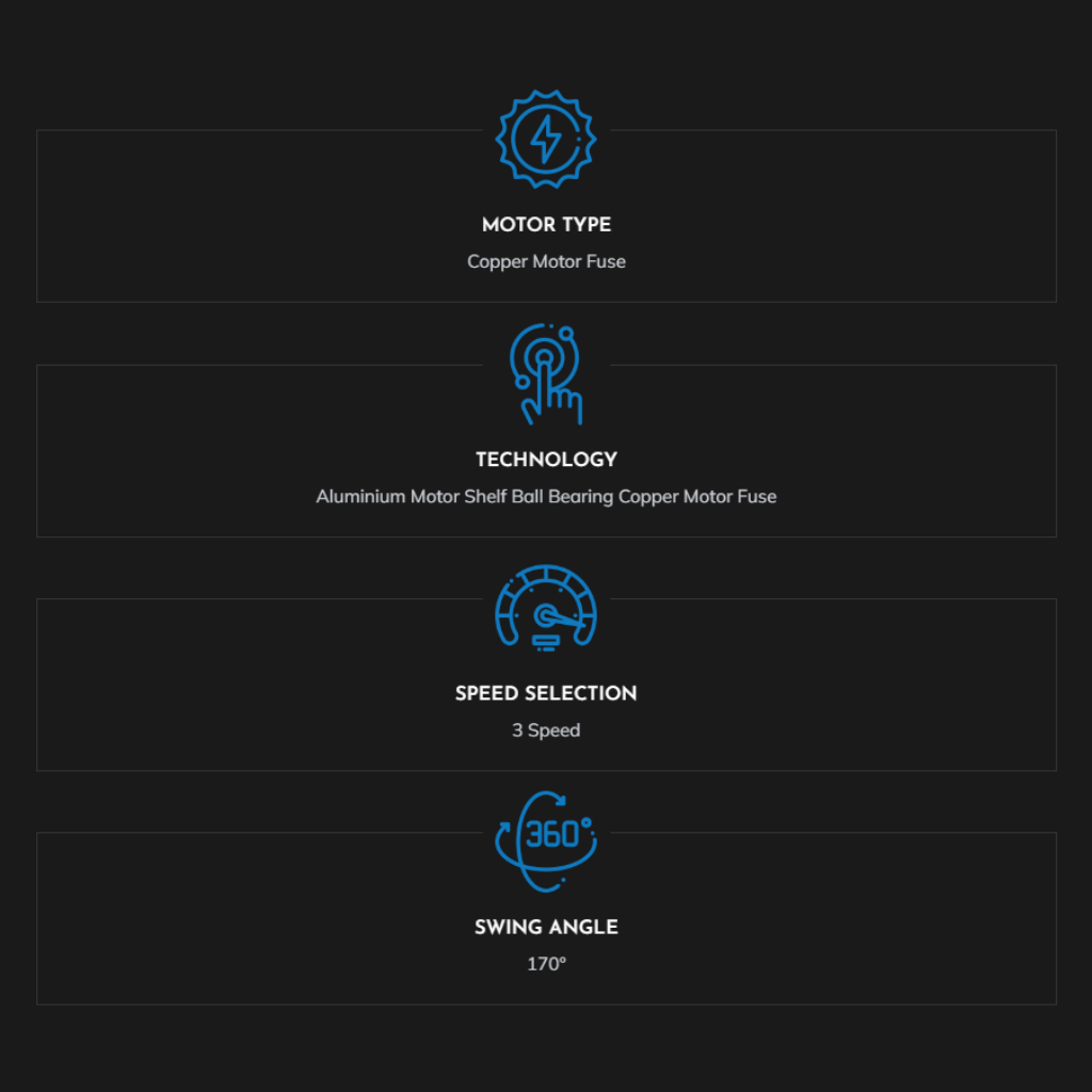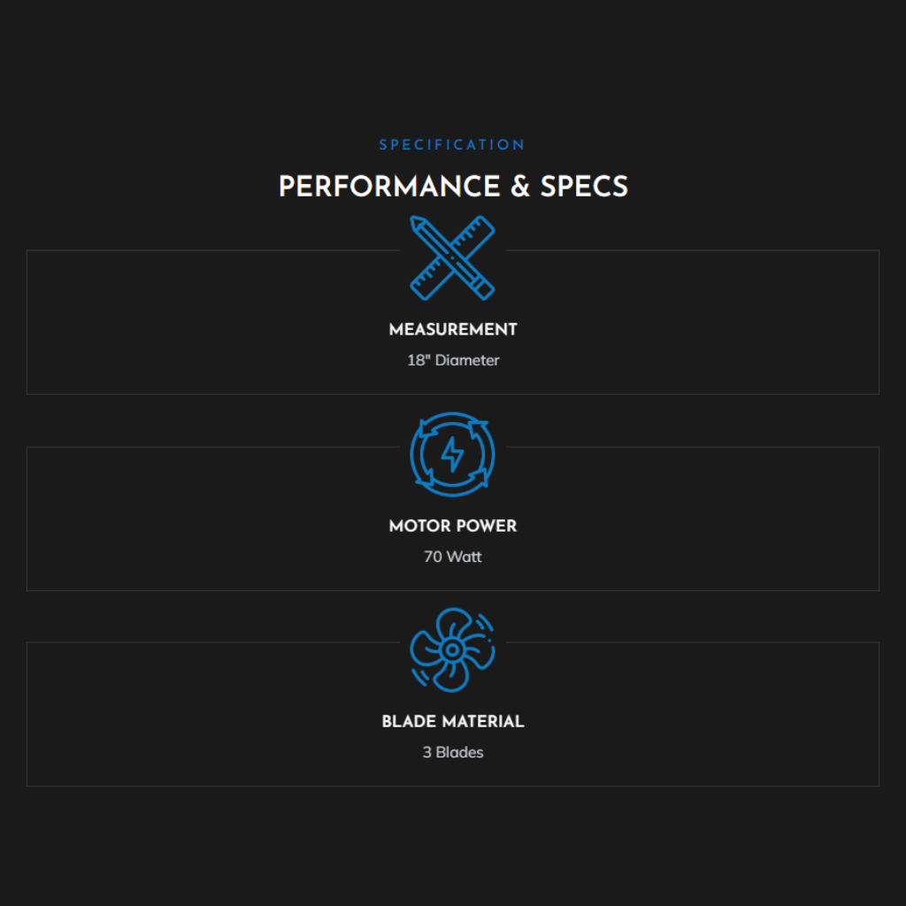 Model: U10 Series Blade Span: 18" Number of Blades: 3B Motor Type: AC Motor Control: Pull String Available Colours: Silver Grey Warranty: 3 Years Warranty on Motor 1 Year Warranty on Internal Parts
