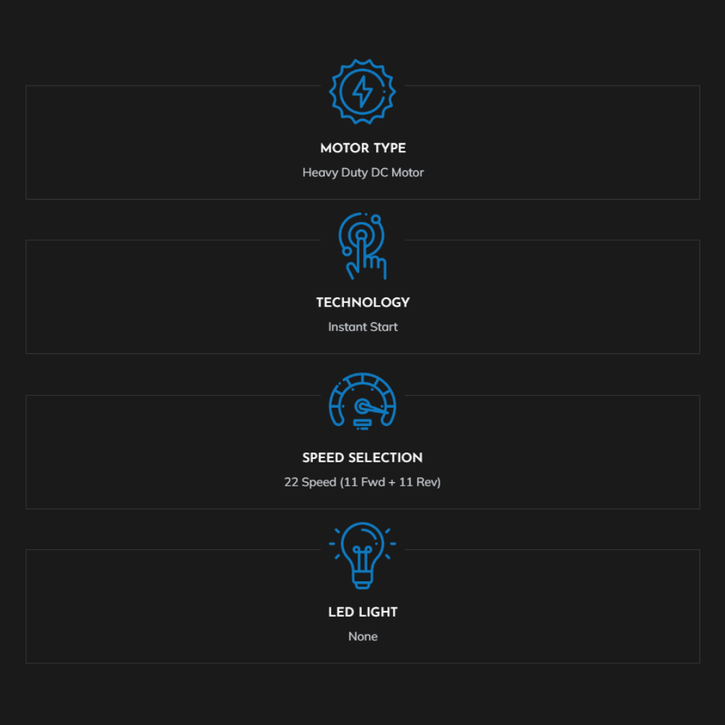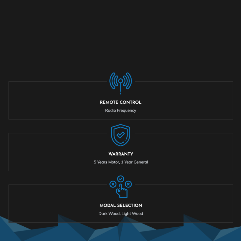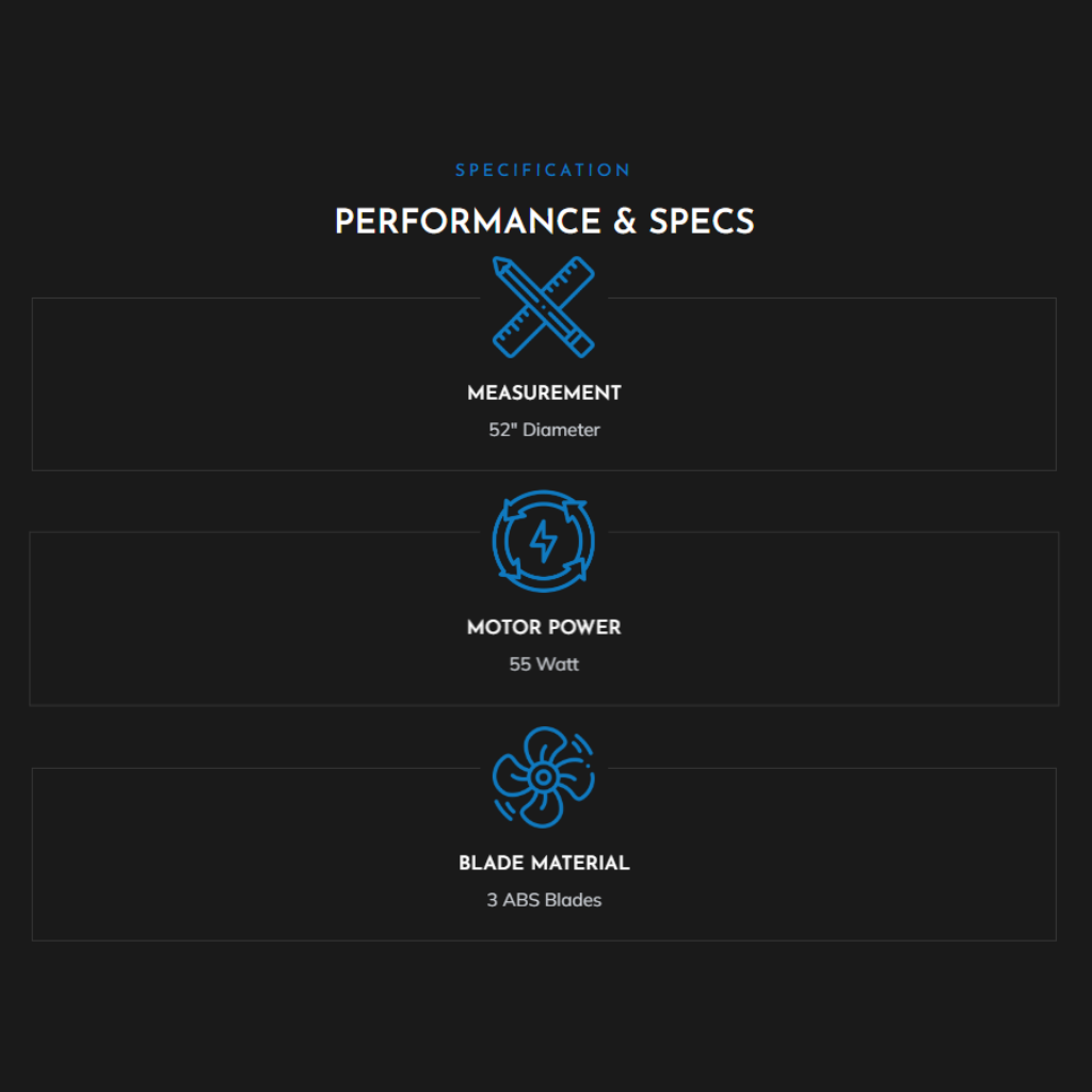 Model: RISTA Series Blade Span: 52" Number of Blades: 3B Motor Type: DC Motor Speed Settings: Multi-Speed (Forward/Reverse) Control: Remote Control Available Colours: Dark Wood Warranty: 5 Years Warranty on Motor 1 Year Warranty on Internal Parts
