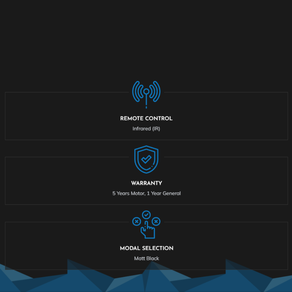 Model: MAGNA Series Blade Span: 78" Number of Blades: 8B Motor Type: DC Motor Speed Settings: Multi-Speed (Forward/Reverse) Control: Remote Control Available Colours: Matt Black Warranty: 5 Years Warranty on Motor 1 Year Warranty on Internal Parts