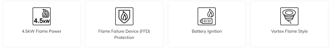 Flame Style: Vortex/Twister - 4.5kW Flame Power Flame Failure Device (FFD) Protection Battery Ignition - Flame Power (kW): L: 4.5 R: 4.5 Flame Style: Vortex/Twister Surface Material: Tempered Glass Burner Material: SS + Brass FFD Protection:Yes Ignition: Battery Type of Gas: LPG Pan Support: Cast Iron Wok Stand: Yes Product Dimension (WxDxH)(mm): 760 x 440 Cut-out Dimension (WxD)(mm): 630 x 330