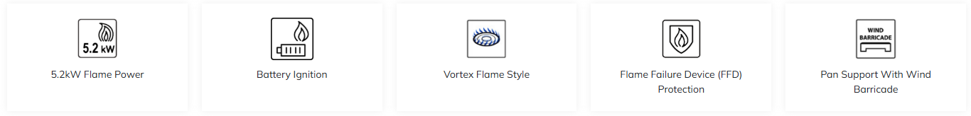 Flame Style: Vortex - 5.2kW High Flame Power Flame Failure Device (FFD) Protection Pan Support with Wind Barricade - Flame Power (kW): L: 5.2 M: 2.0 R: 5.2 Flame Style: Vortex/Twister Surface Material: Stainless Steel Burner Material: SS + Brass FFD Protection: Yes Ignition: Battery Type of Gas: LPG Pan Support: Cast Iron Wok Stand: Yes Product Dimension (WxDxH)(mm): 760 x 450 Cut-out Dimension (WxD)(mm): 680 x 380