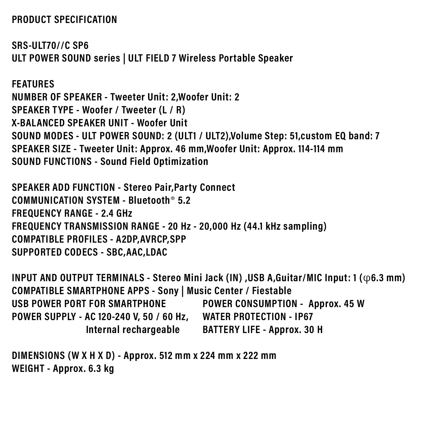 Buy Sony ULT Field 7 Speaker (SRS-ULT70) with earth-shaking bass. Features IP67 waterproof rating & 30hr battery. Original 1 Year Warranty & best price. Shop now.