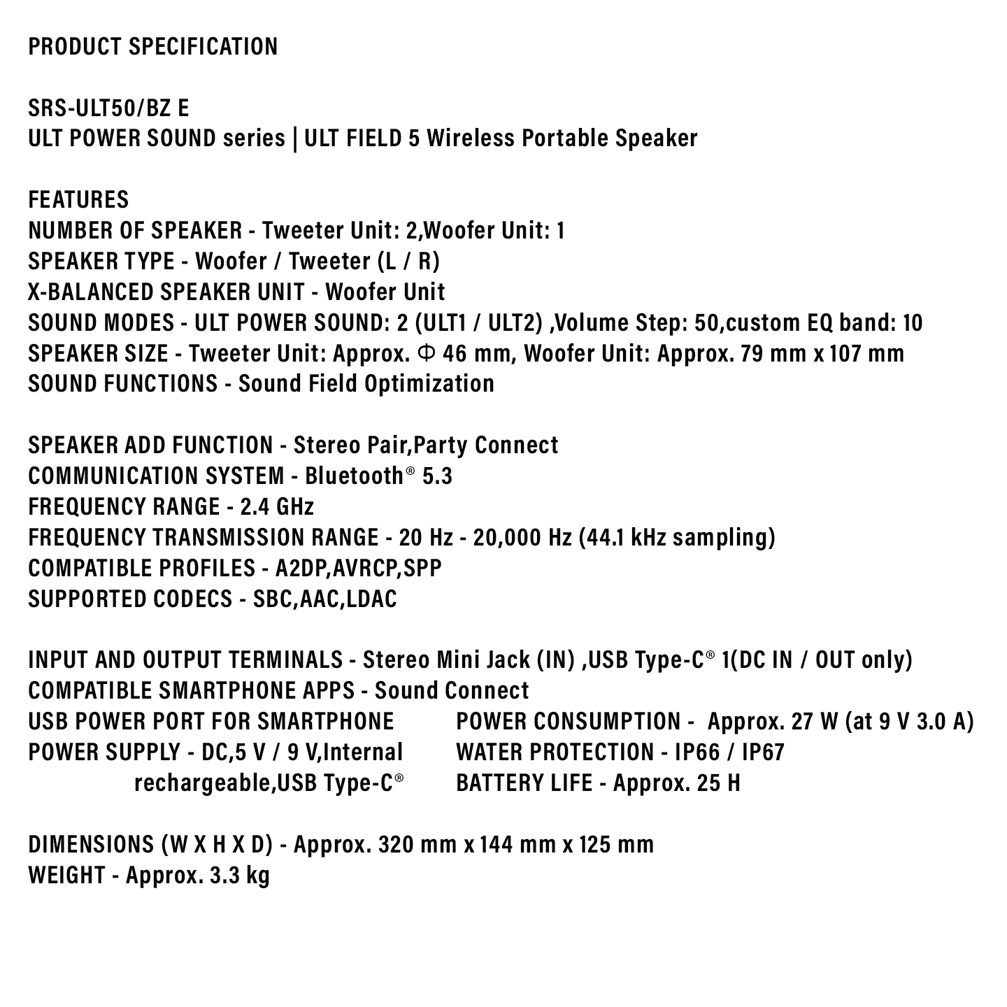 Buy Sony ULT Series Speaker Black (SRS-ULT50) with massive sound pressure. Features dynamic lighting & deep bass mode. Original 1 Year Warranty & best price. Shop now.