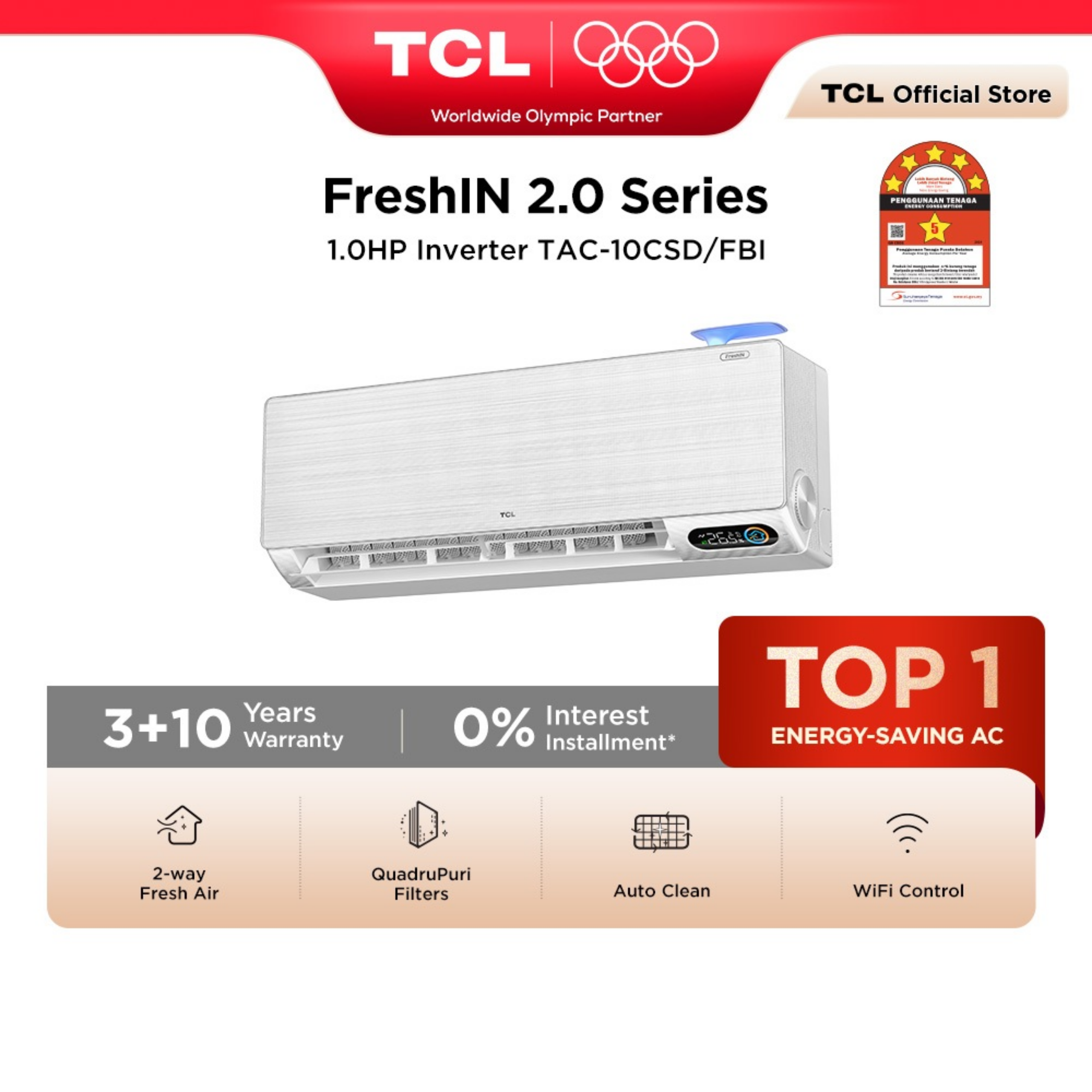 TCL 1.0HP Fresh-in 2.0 Air Conditioner TAC-10CSD/FBI Features: - Series: Fresh-in 2.0 - Capacity: 1.0HP - Fresh-in Air System - Two-way Fresh Air Replacement - Energy Saving Inverter Warranty: 3 Years General Warranty + 10 Years Compressor Warranty