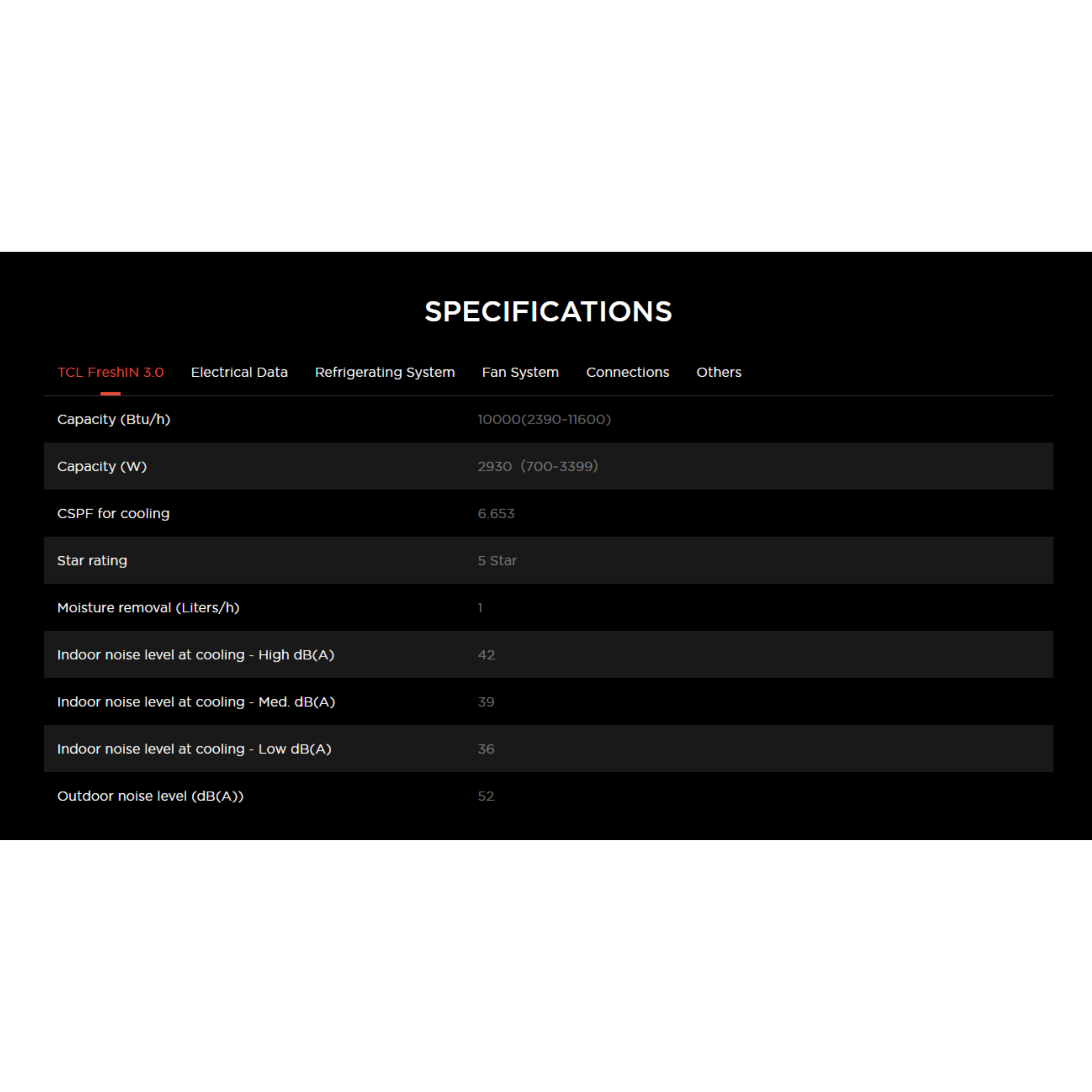 TCL 1.0HP Fresh-in 3.0 Air Conditioner TAC-10CSD/P7 Features: - Series: Fresh-in 3.0 - Capacity: 1.0HP - Fresh-in Air System - Energy Saving Inverter - Quadruple Filtration Warranty: 3 Years General Warranty + 10 Years Compressor Warranty