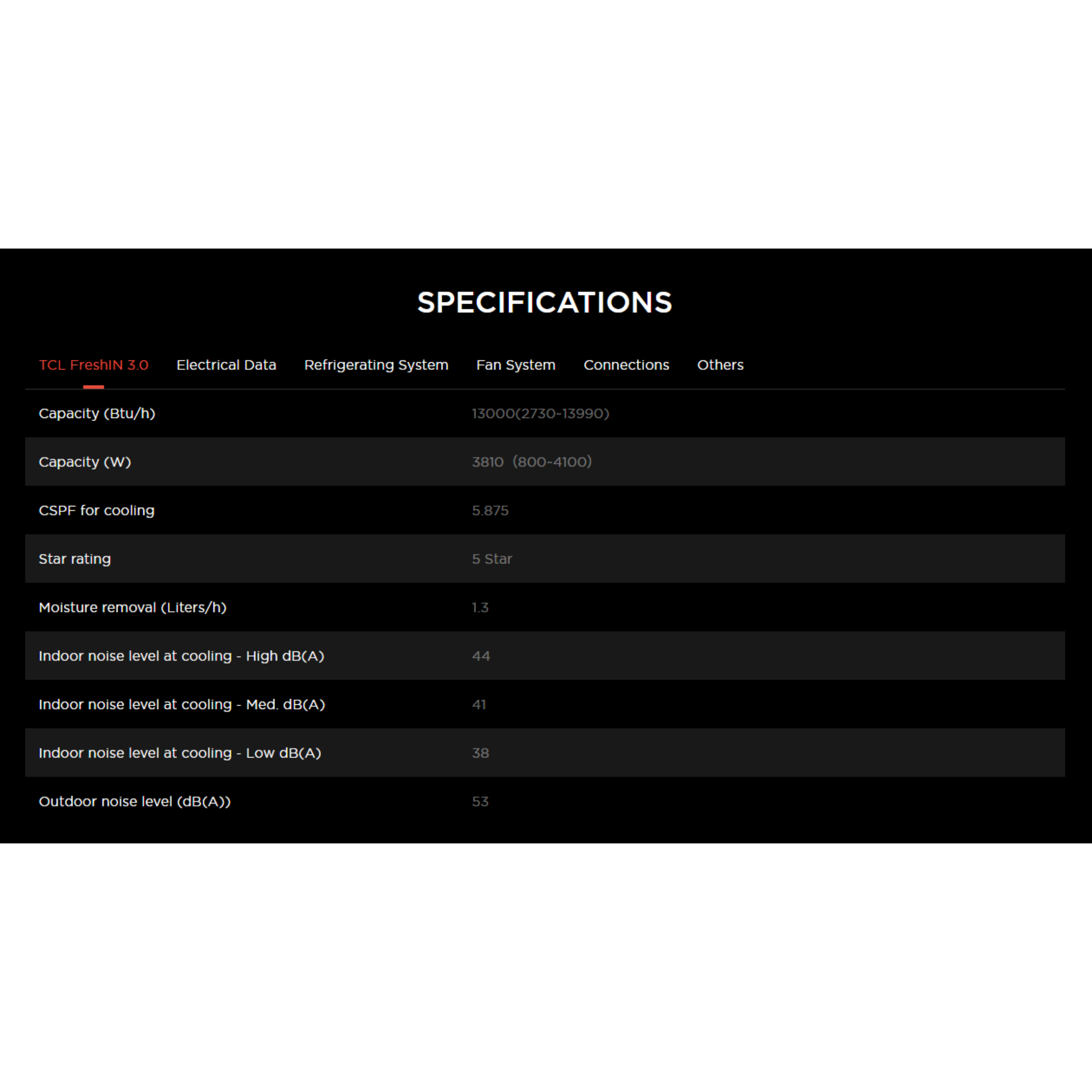 TCL 1.5HP Fresh-in 3.0 Air Conditioner TAC-13CSD/P7 Features: - Series: Fresh-in 3.0 - Capacity: 1.5HP - Fresh-in Air System - Energy Saving Inverter - Quadruple Filtration Warranty: 3 Years General Warranty + 10 Years Compressor Warranty