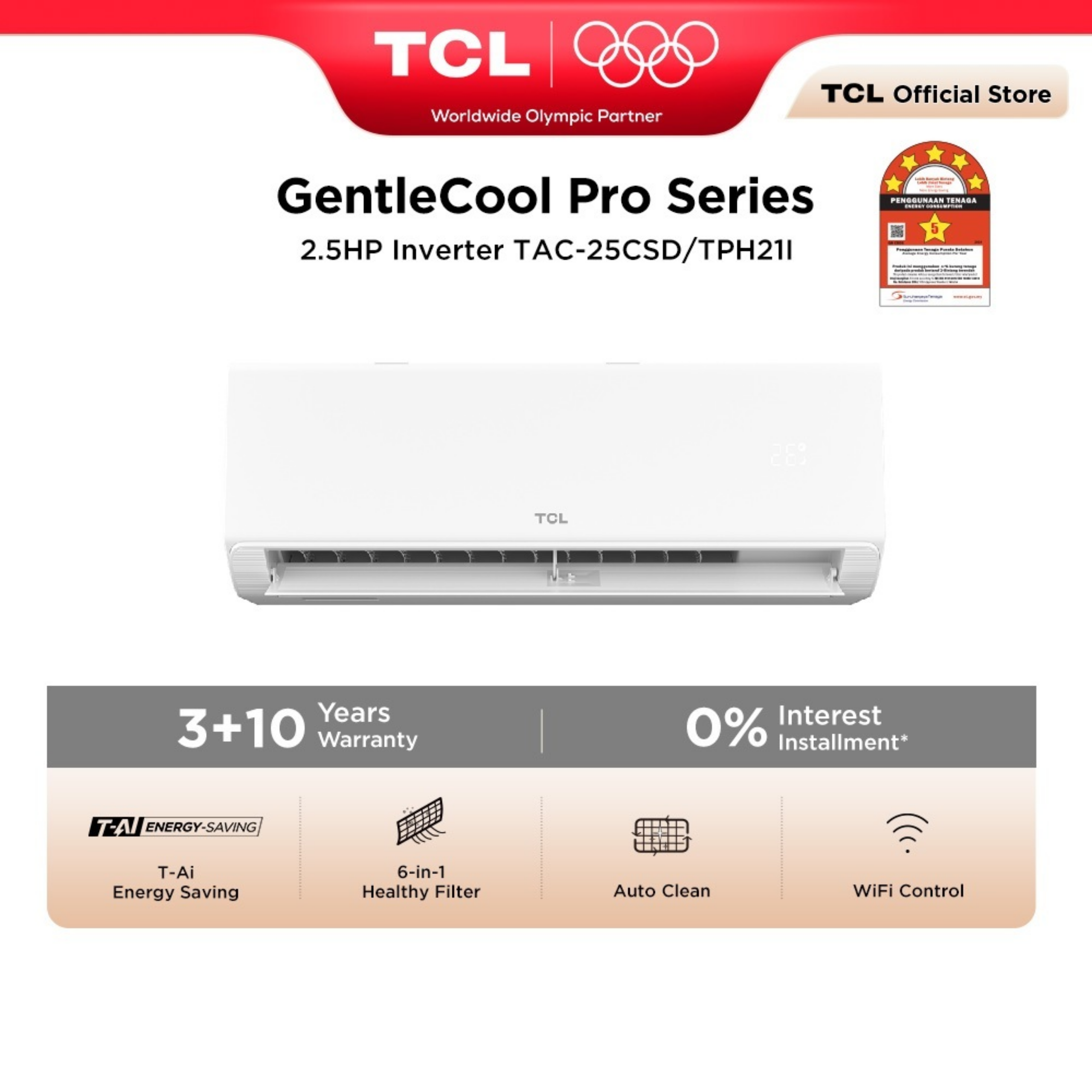 TCL 2.5HP Gentle Cool Pro 5 Star Inverter Air Conditioner TAC-25CSD/TPH21I Features: - Series: Gentle Cool Pro - Capacity: 2.5HP - 5 Star Energy Rating - Gentle Cool Wind - Energy Saving Inverter Technology - Smart Control Warranty: 3 Years General Warranty + 10 Years Compressor Warranty