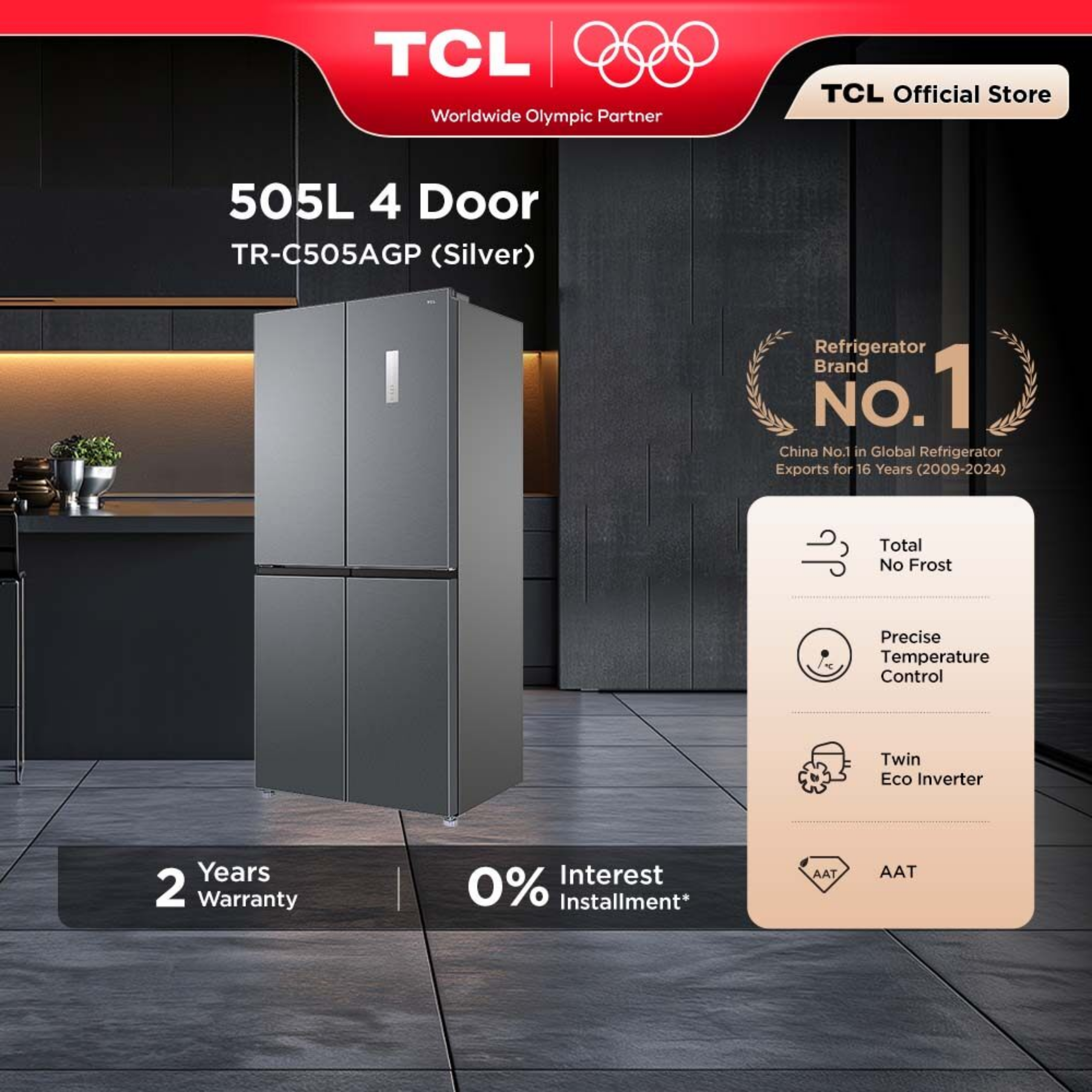 TCL 394L Refrigerator TR-C505AGWP Features: - 4 Door Design - Glass White Finish - Total No Frost - AAT (Auto Anion Technology) - Eco Inverter - Dry-Wet Storage Drawer - LED Display - Multi Air Flow - Net Capacity: 394L Warranty: 2 Years General Warranty + 10 Years Compressor Warranty