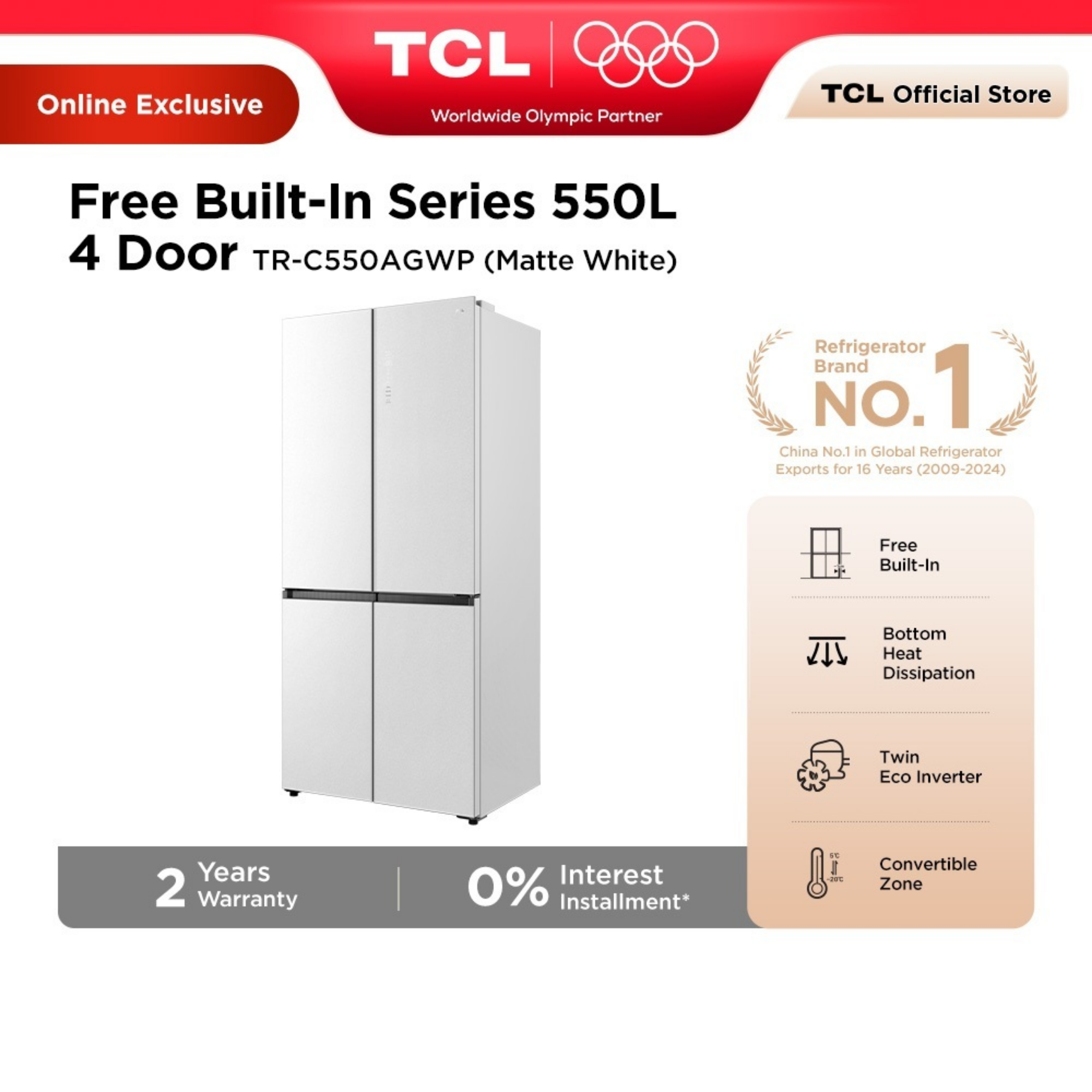 TCL 456L Refrigerator TR-C550AGWP Features: - Free Built-in Series - 4 Door Design - Matte Glass White (冰釉白) - T-Fresh - Convertible Zone - Precise Temp Drawer - Total No Frost - Twin Eco Inverter - Power Cool & Power Freeze - Multi Air Flow - Pure Air Technology - Net Capacity: 456L Warranty: 2 Years General Warranty + 10 Years Compressor Warranty