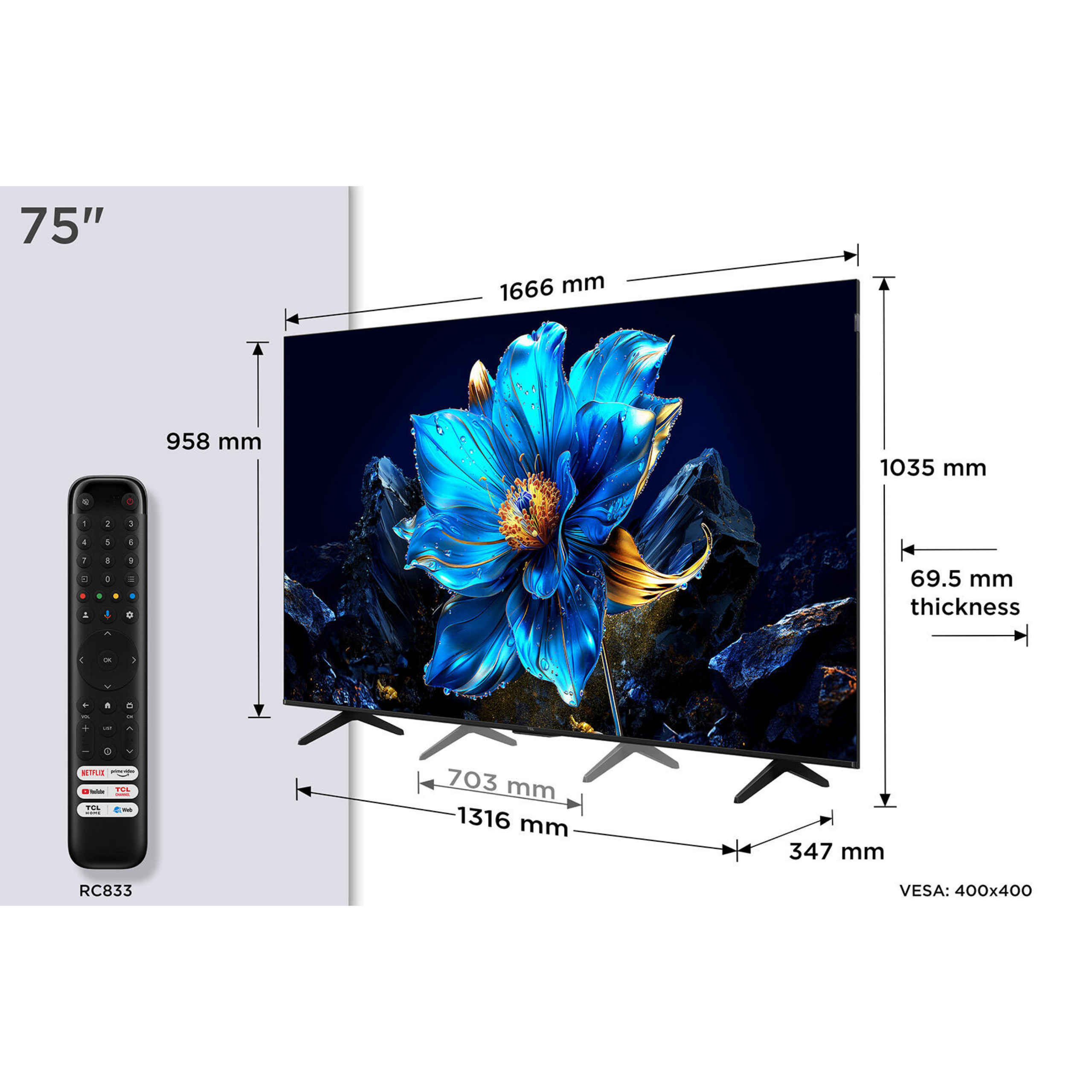 TCL 75 inch QLED TV 75C655 Features: - Series: QLED TV - New QLED:Colorful Quantum Crystal - Color Optimization - Technology - AiPQ Processor - HVA Pannel - Game - Accelerator 120 VRR Warranty: 3 Years