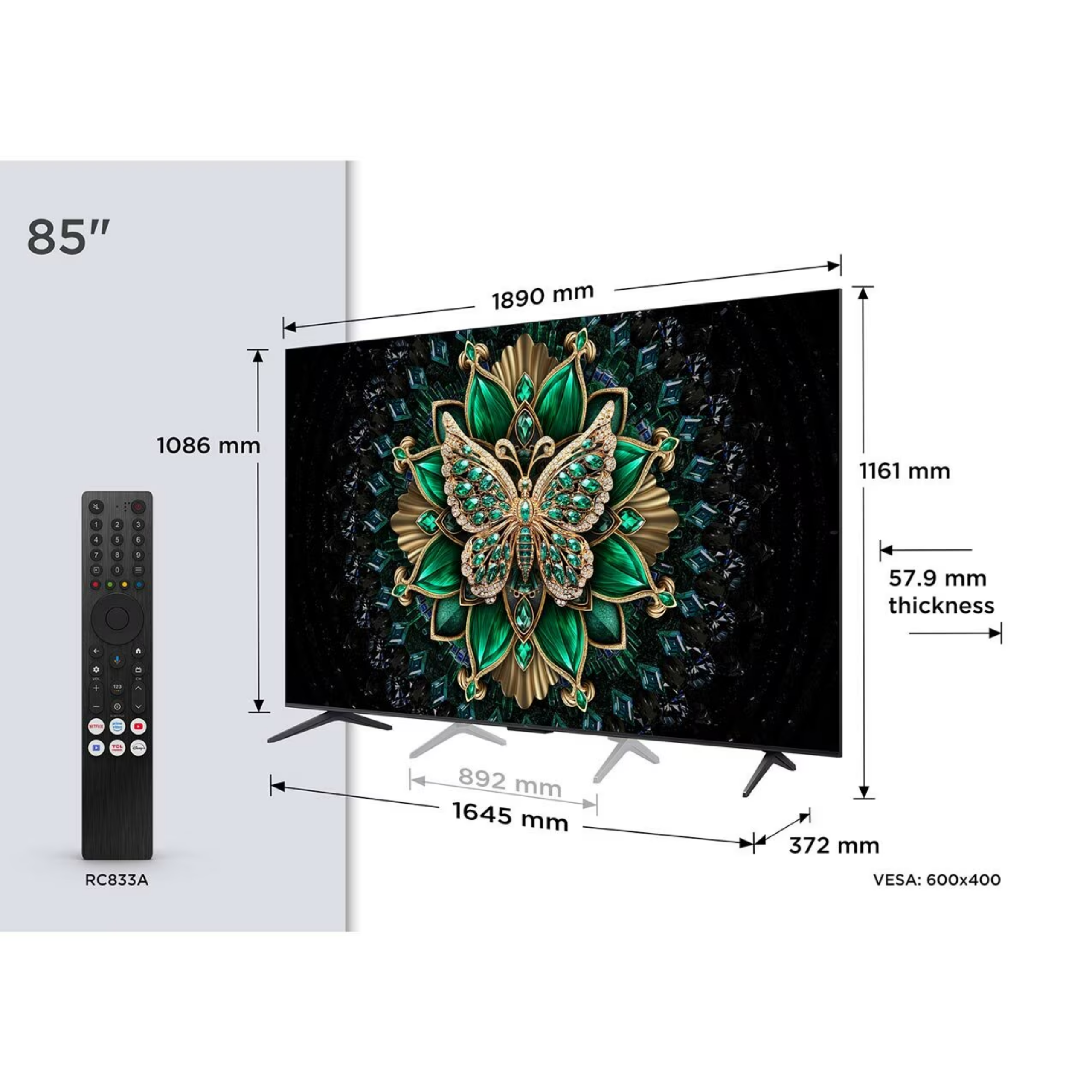 TCL 85 inch QDMINILED TV 85C6K Features: - Series: QDMINILED TV - QD-MiniLED - Precise Dimming Zones - HDR1000nits - 144HzPanel - 288Hz VRR - Onkyo 2.1 Sound - AiPQ Pro - Processor Warranty: 3 Years