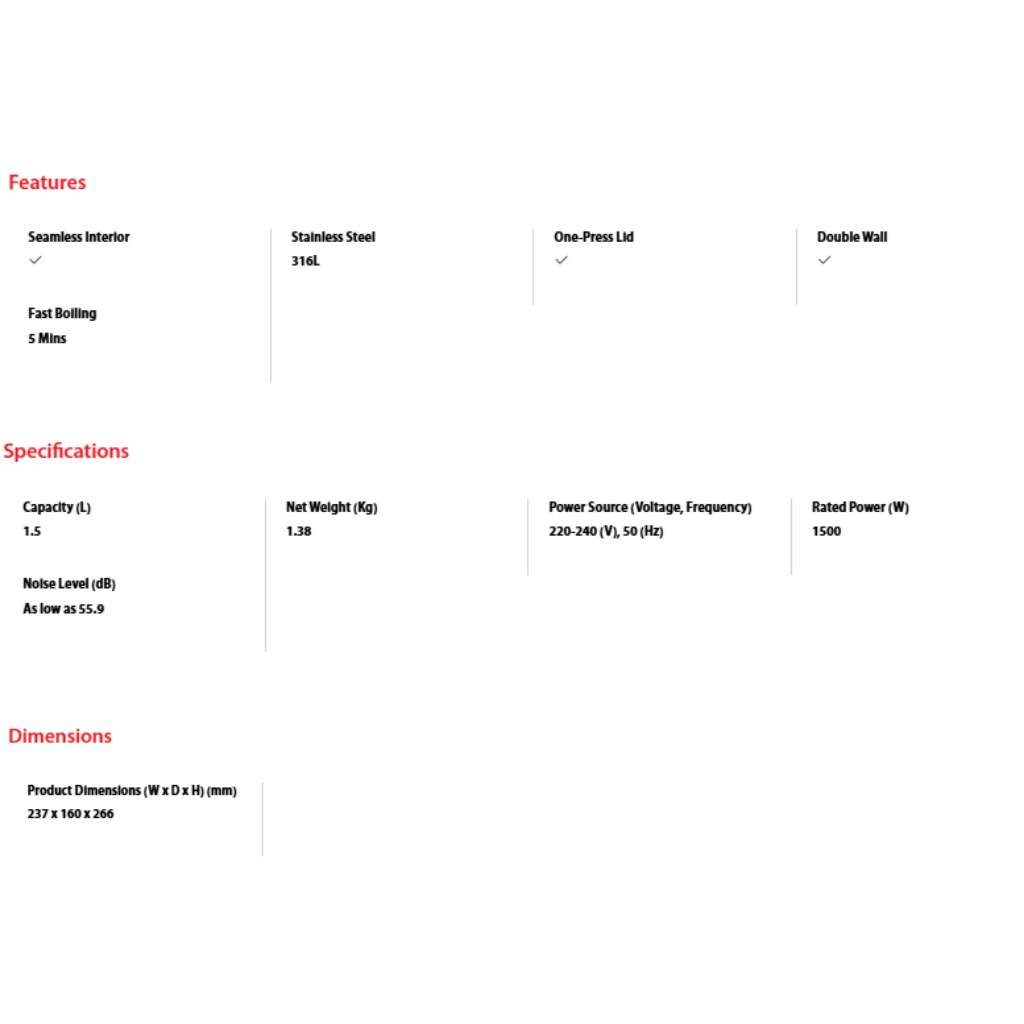 • Capacity: 1.5L. • Features: Leakproof. • Warranty: 1 Year General Warranty.