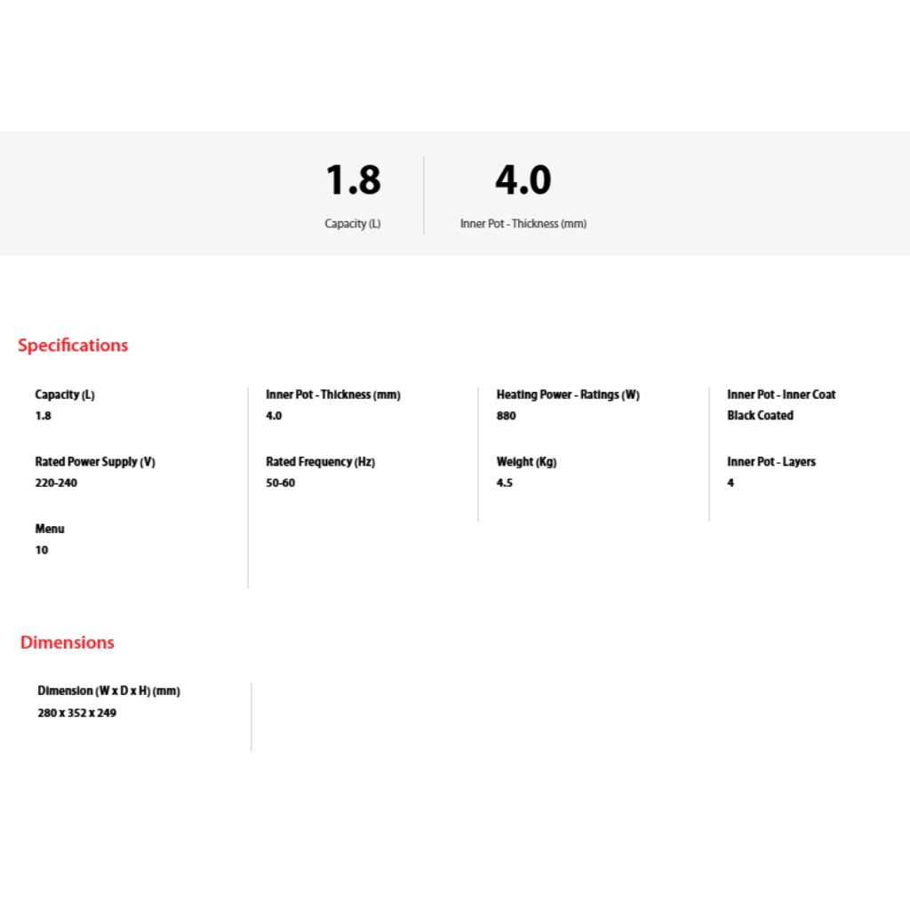 • Capacity: 1.8L. • Features: Digital Control, Thick Pot. • Color: White. • Warranty: 1 Year General Warranty.