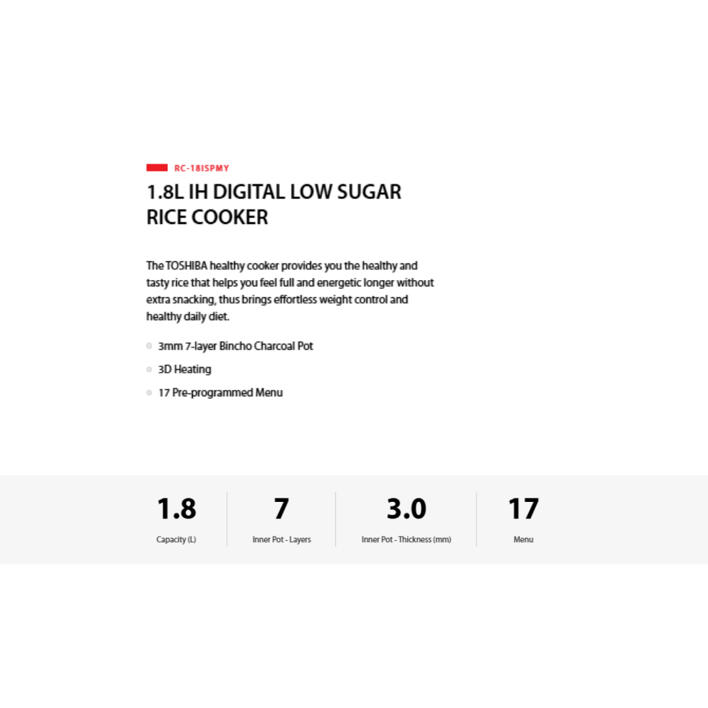 TOSHIBA 1.8L IH DIGITAL LOW SUGAR RICE COOKER(GREY METAL) RC-18ISPMY