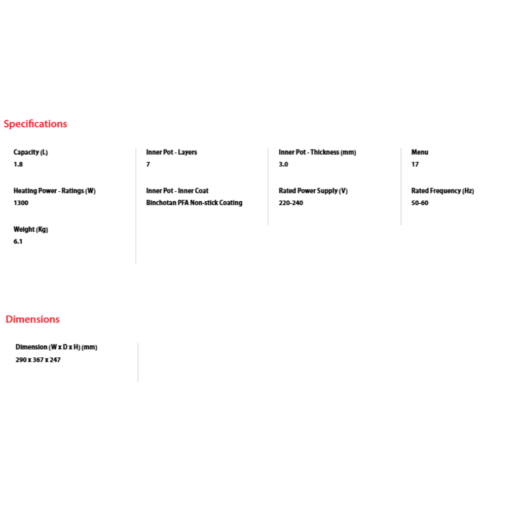 • Capacity: 1.8L• Tech: Induction Heating (IH) for even cooking. • Features: Low Sugar function (Healthy Rice), Touch Panel. • Warranty: 1 Year General Warranty.