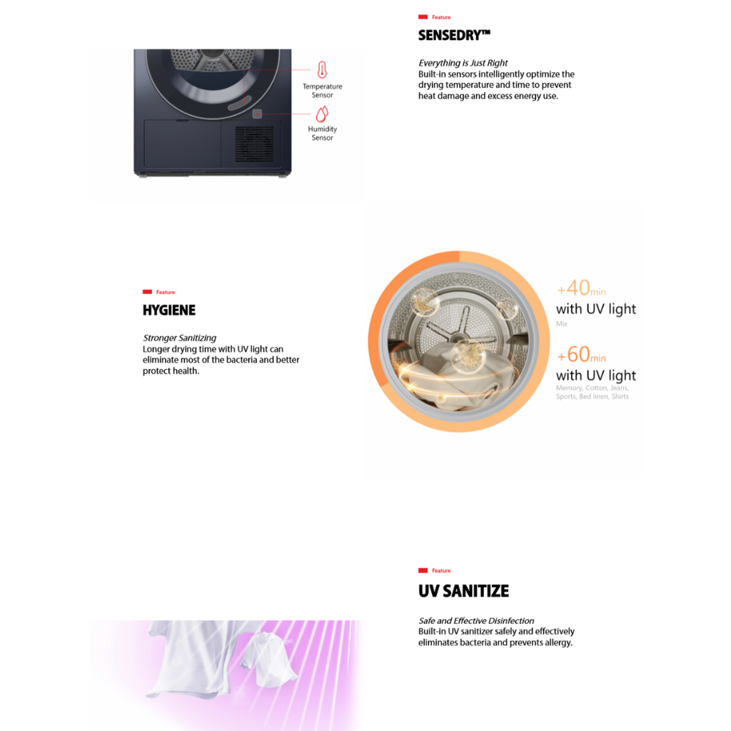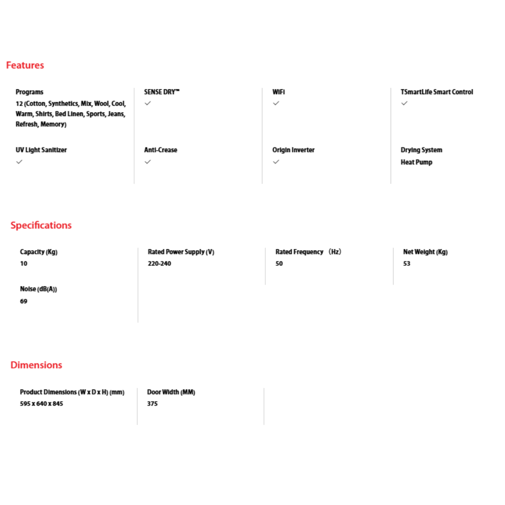 • Capacity: 10.0kg. • Features: Heat Pump Technology, Origin Inverter. • Color: Morandi Grey. • Warranty: 12 Years Motor, 2 Years General Warranty.