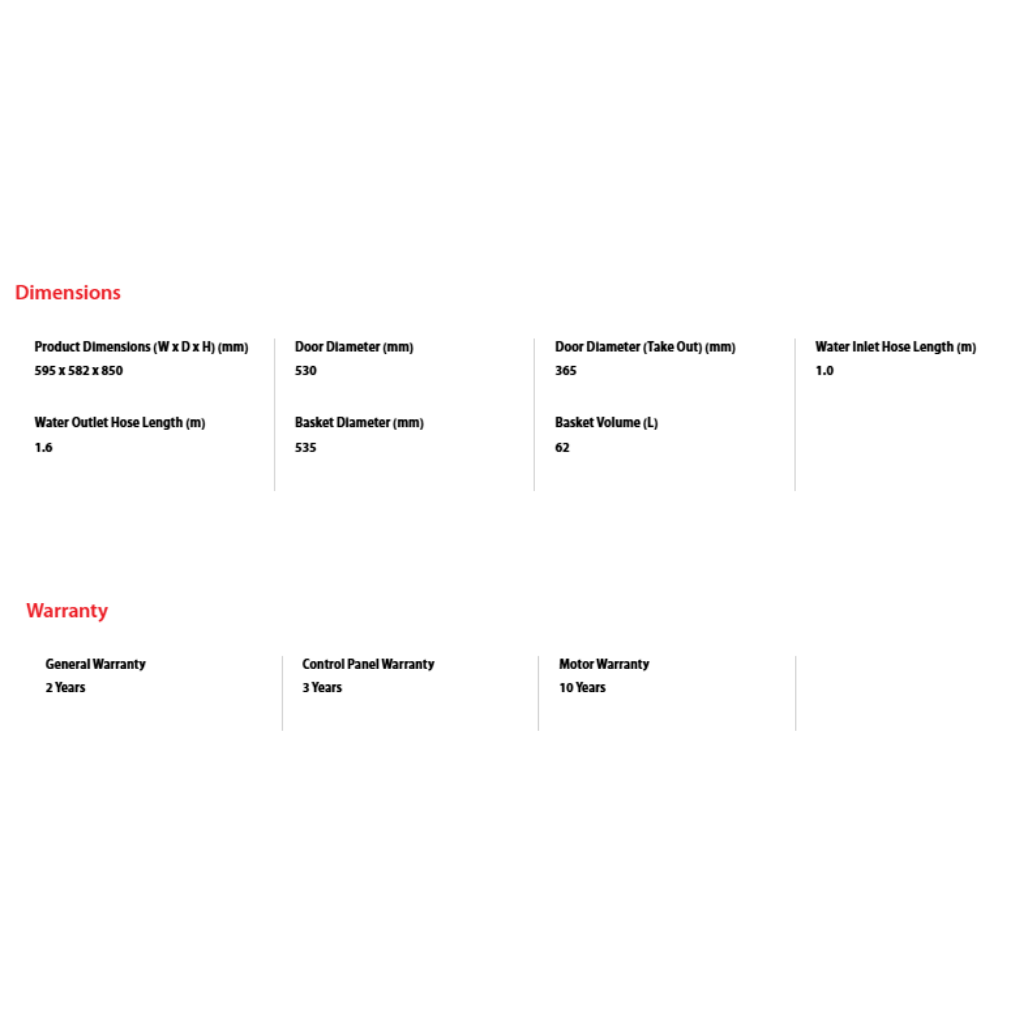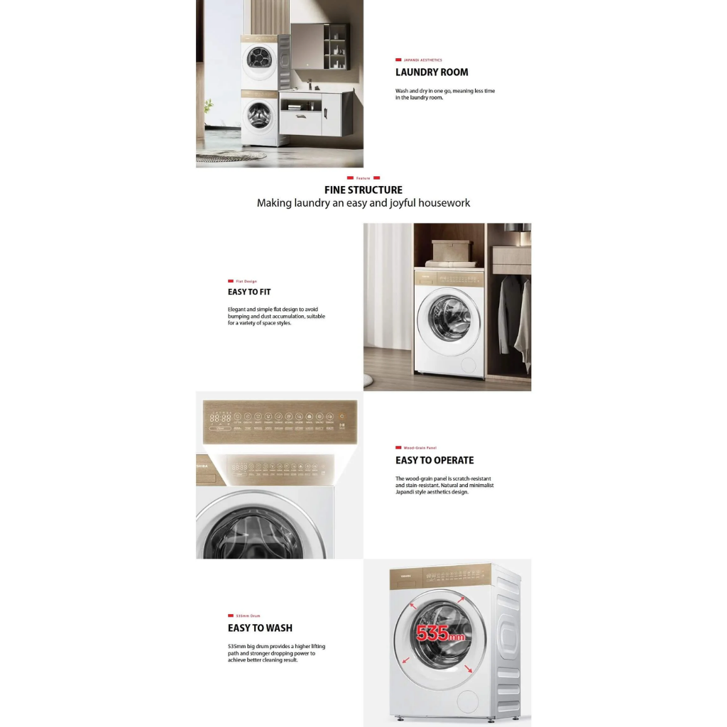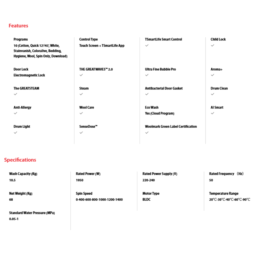 • Capacity: 10.5kg. • Features: Japandi Design, Origin Inverter, Ultra Fine Bubble. • Color: White. • Warranty: 12 Years Motor, 2 Years General Warranty.