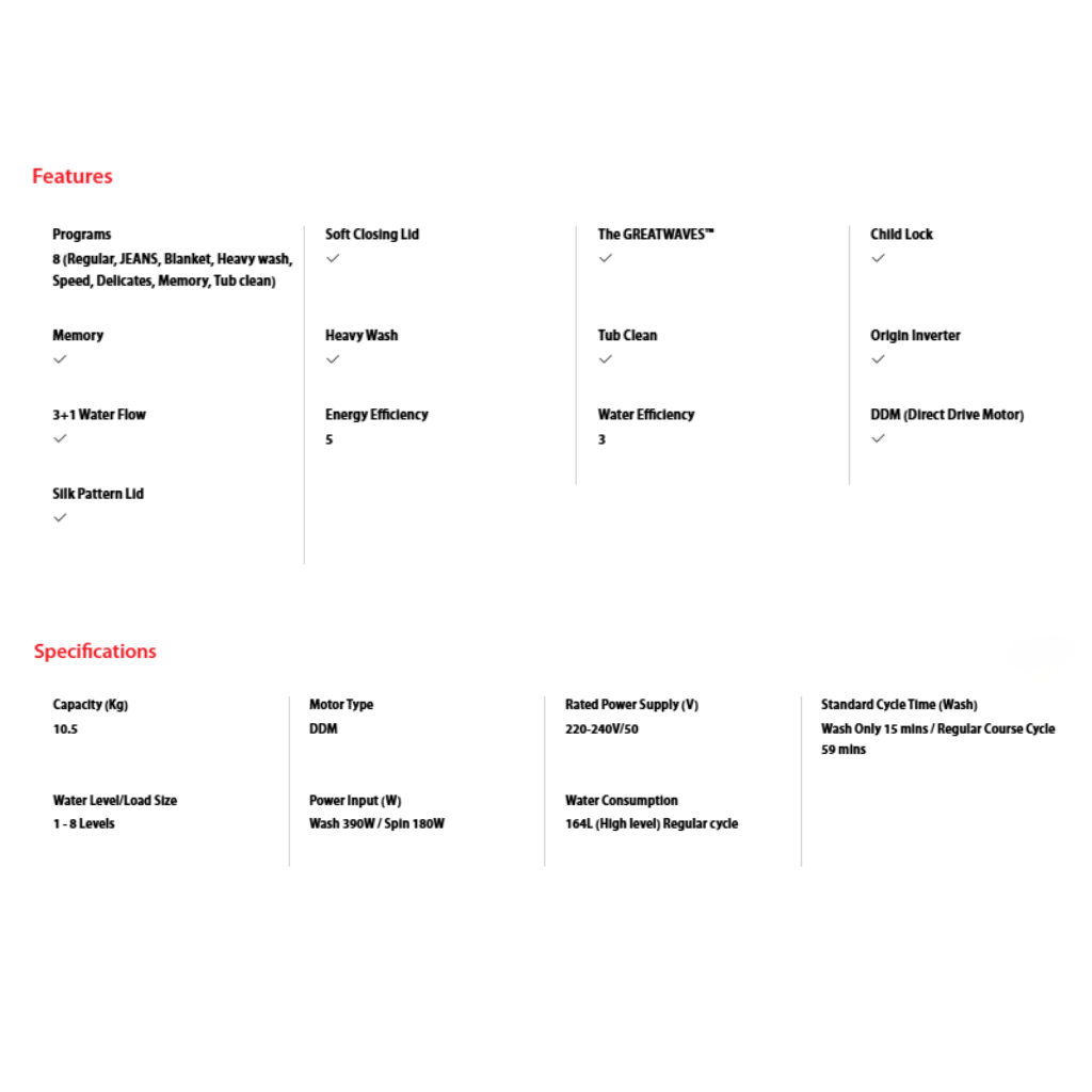 • Capacity: 10.5kg. • Features: Origin Inverter, GreatWaves™. • Color: Silver. • Warranty: 12 Years Motor, 2 Years General Warranty.