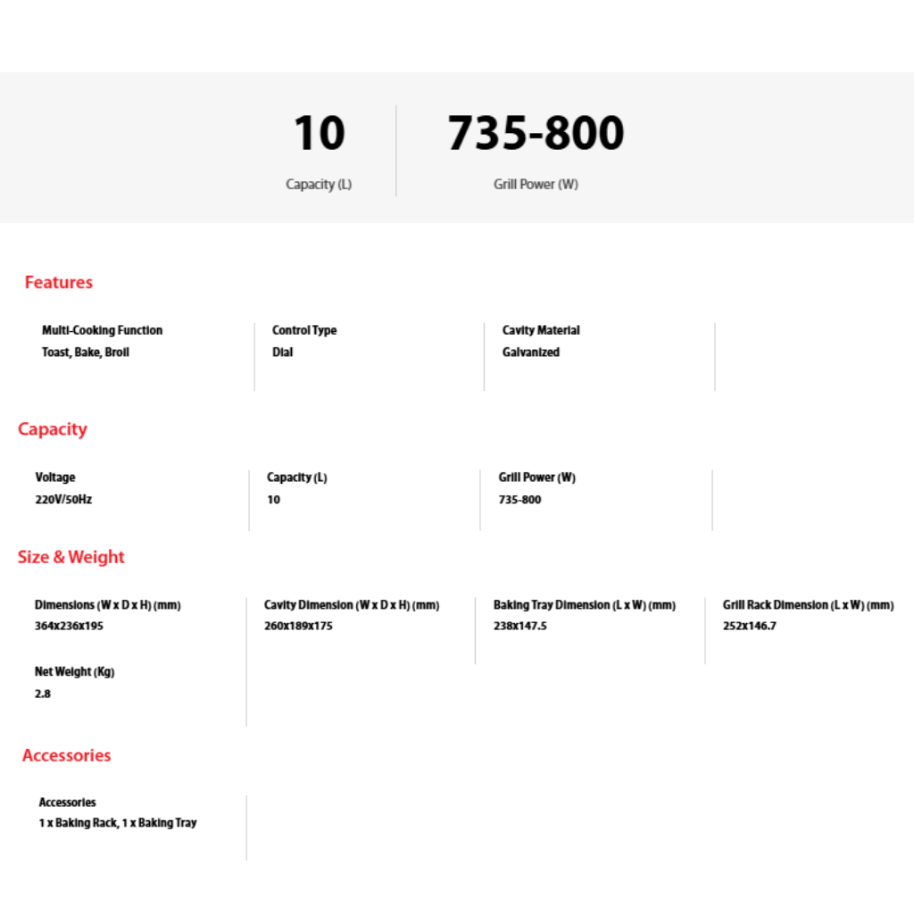 • Capacity: 10L. • Features: Toasting, Baking, Heating. • Color: White. • Warranty: 1 Year General Warranty.