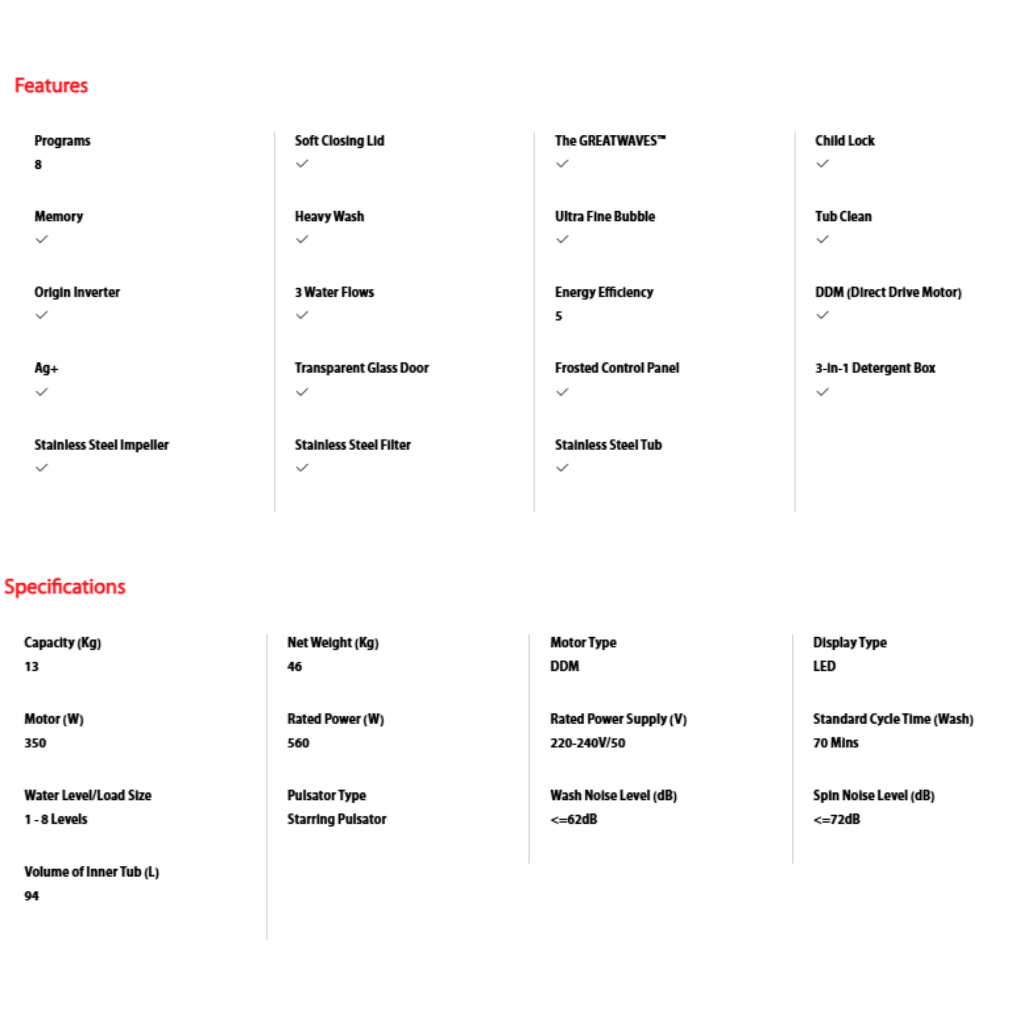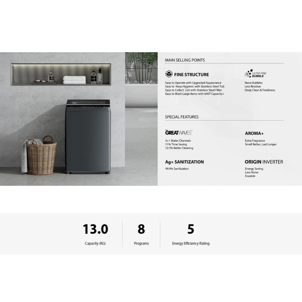 • Capacity: 13.0kg. • Features: DD Inverter, Ultra Fine Bubble, Aroma+. • Finish: Dark Grey. • Warranty: 12 Years Motor, 2 Years General Parts & Labour.