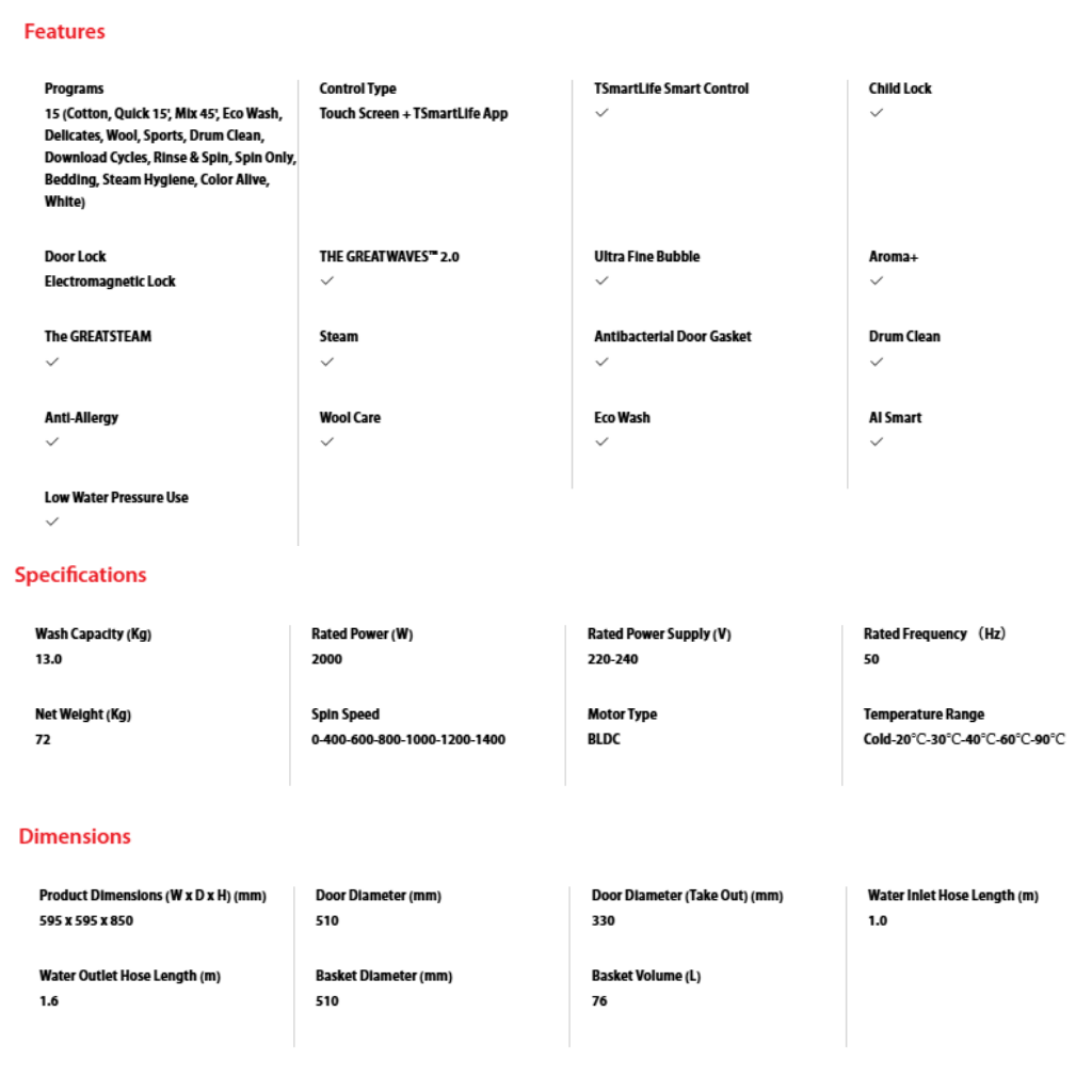 • Capacity: 13.0kg. • Features: Origin Inverter, GreatWaves™ 2.0, Ultra Fine Bubble. • Color: Morandi Grey. • Warranty: 12 Years Motor, 2 Years General Warranty.
