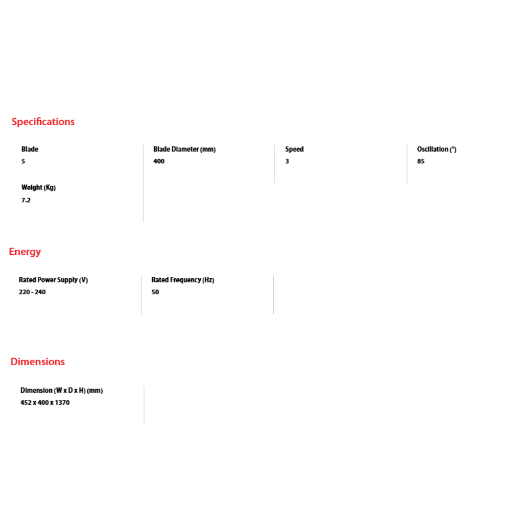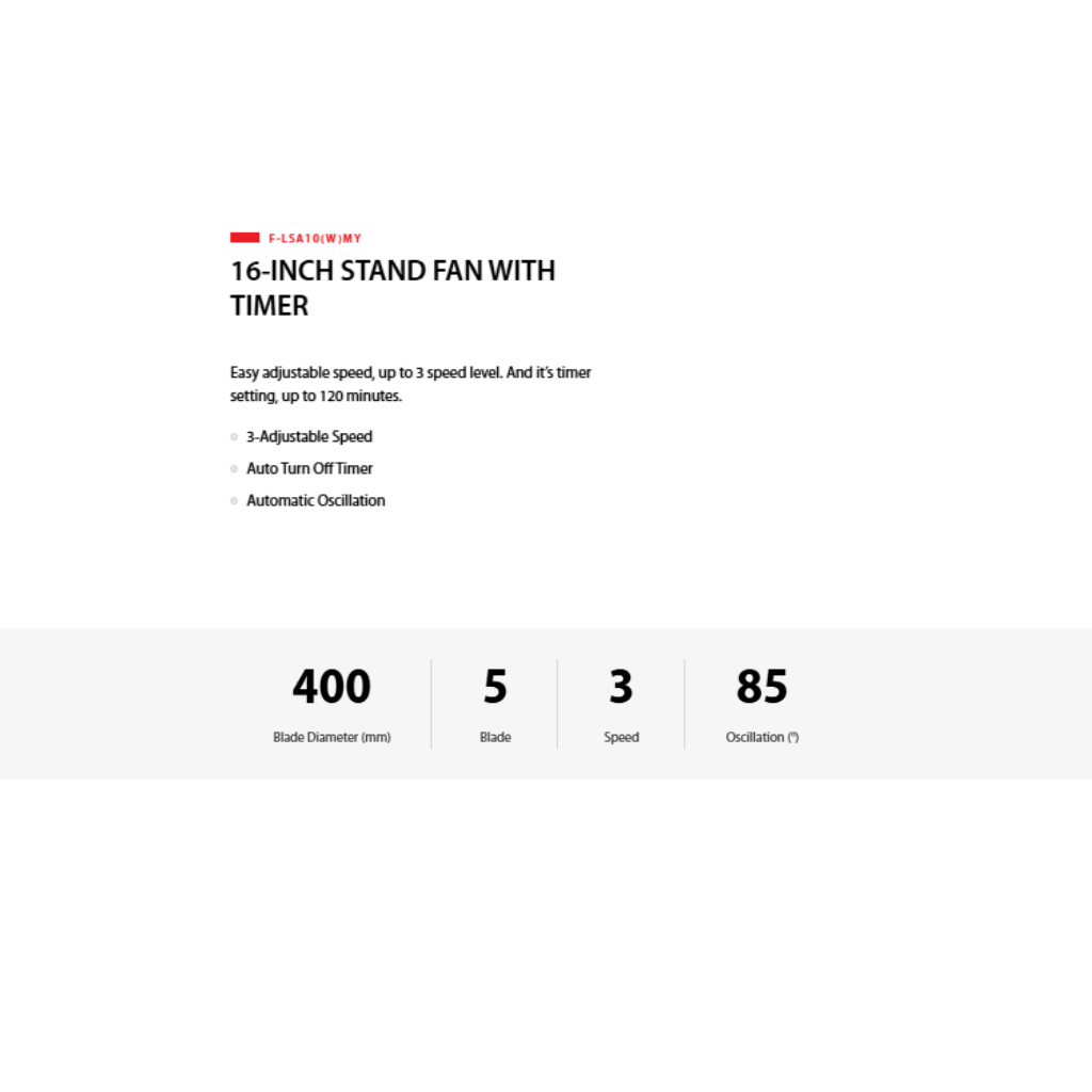 • Size: 16 Inch (5 Blades). • Features: 3 Speed Levels, Timer. • Color: White. • Warranty: 1 Year General Warranty.