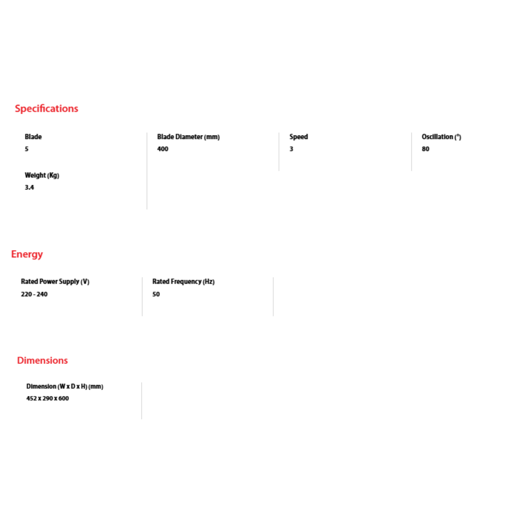 • Size: 16 Inch (5 Blades). • Features: 3 Speed Levels. • Warranty: 1 Year General Warranty.