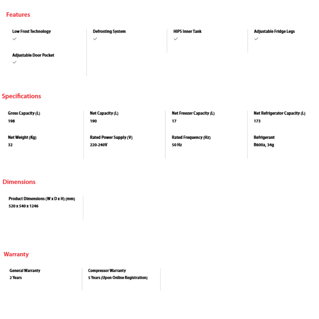 • Capacity: 198L Gross. • Features: Single Door, Separate Chiller Compartment. • Color: Satin Grey. • Warranty: 5 Years Compressor, 2 Year General Warranty.