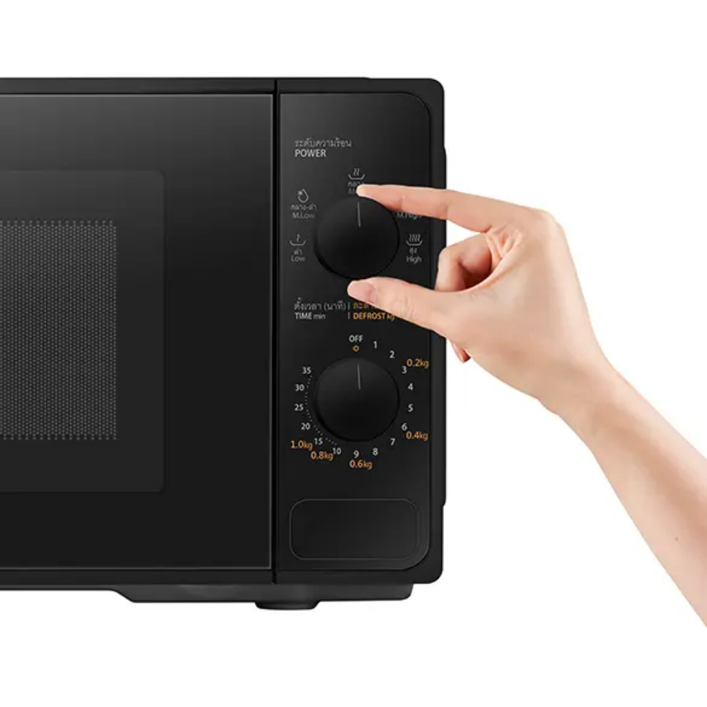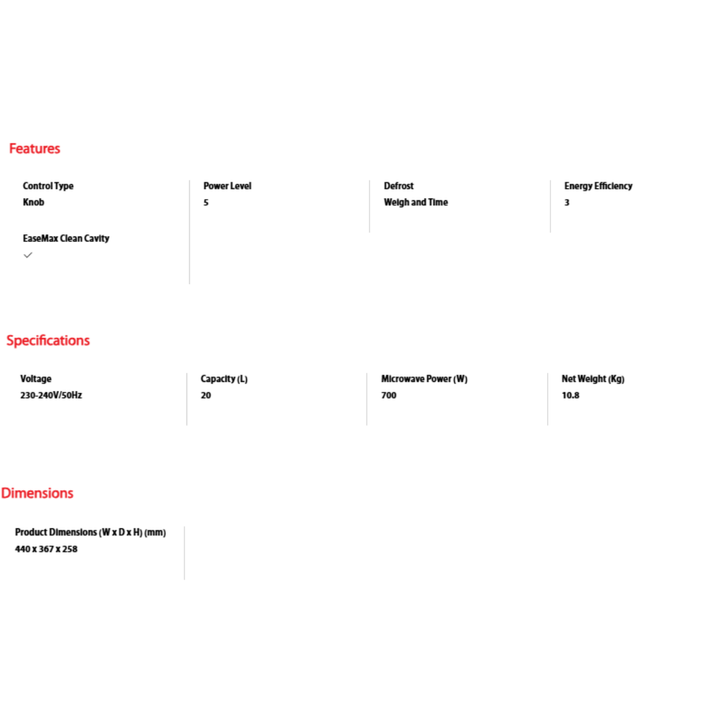 • Capacity: 20L Solo. • Control: Dial Control. • Features: 5 Power Levels, Defrost by Weight/Time. • Color: Black. • Warranty: 1 Year General Warranty.