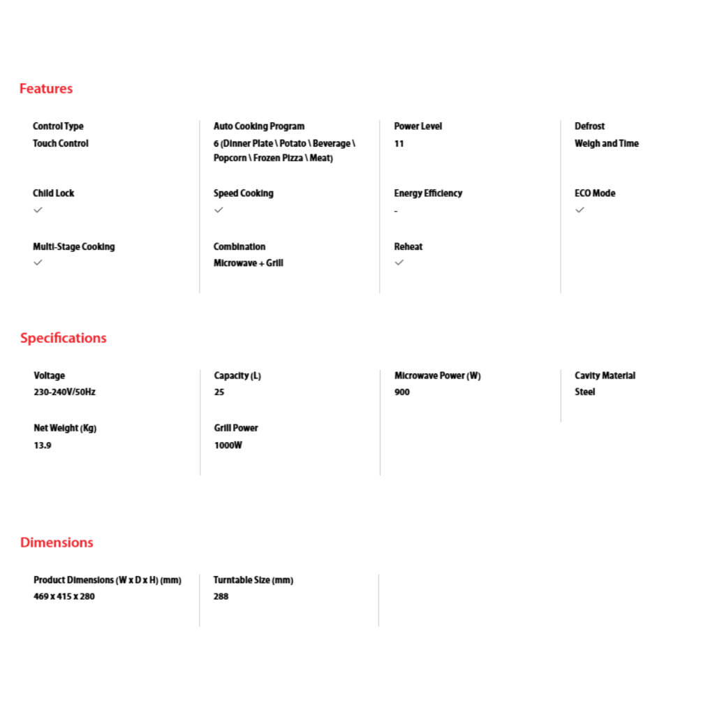 • Capacity: 25L. • Features: Grill Function, Digital Control. • Color: Black. • Warranty: 1 Year General Warranty.