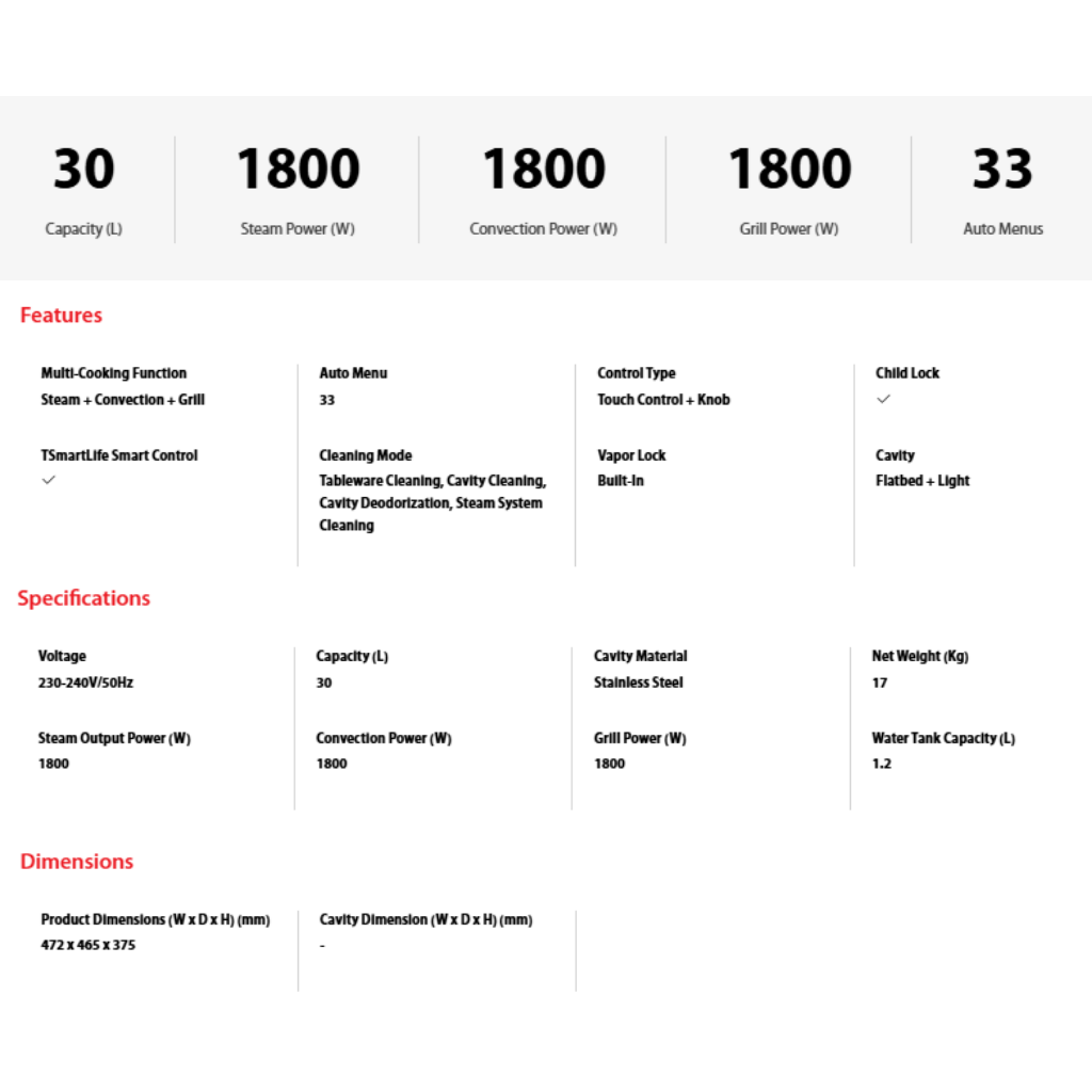 • Capacity: 30L. • Features: Superheated Steam, Convection, Air Fry. • Color: Black. • Warranty: 1 Year General Warranty.