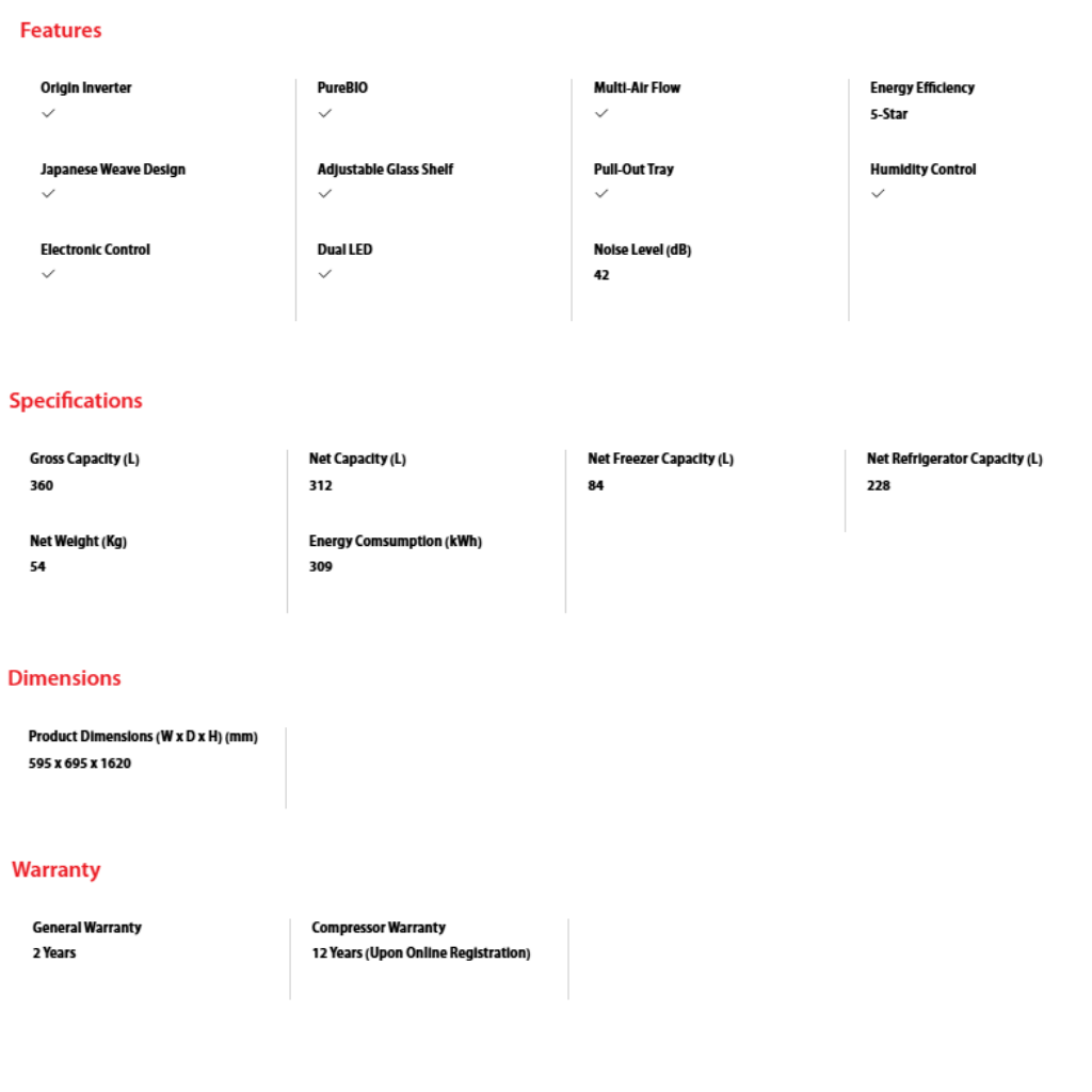 • Capacity: 360L Gross. • Features: Origin Inverter, AirFall Cooling, PureBIO. • Finish: Metal. • Warranty: 12 Years Compressor, 2 Years General Warranty.