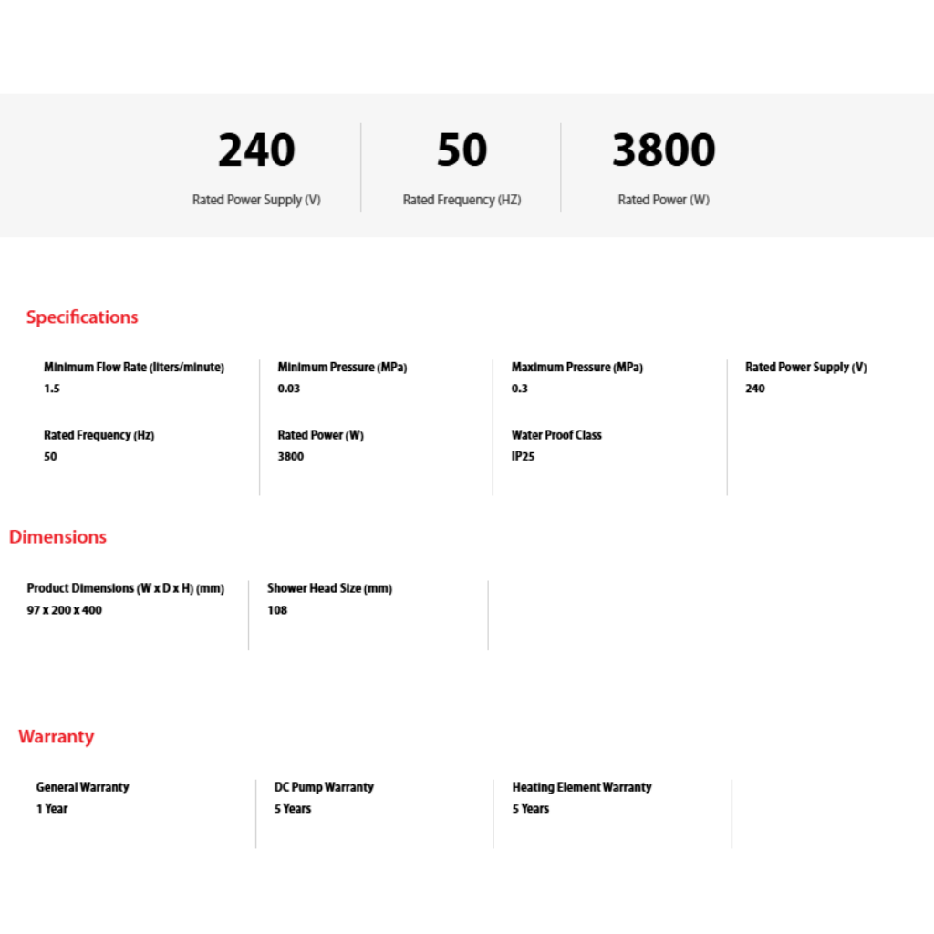 • Power: 3.8kW. • Features: DC Silent Pump, SafeGuard System. • Color: White. • Warranty: 5 Years Pump, 5 Years Heating Element, 1 Year General Warranty.