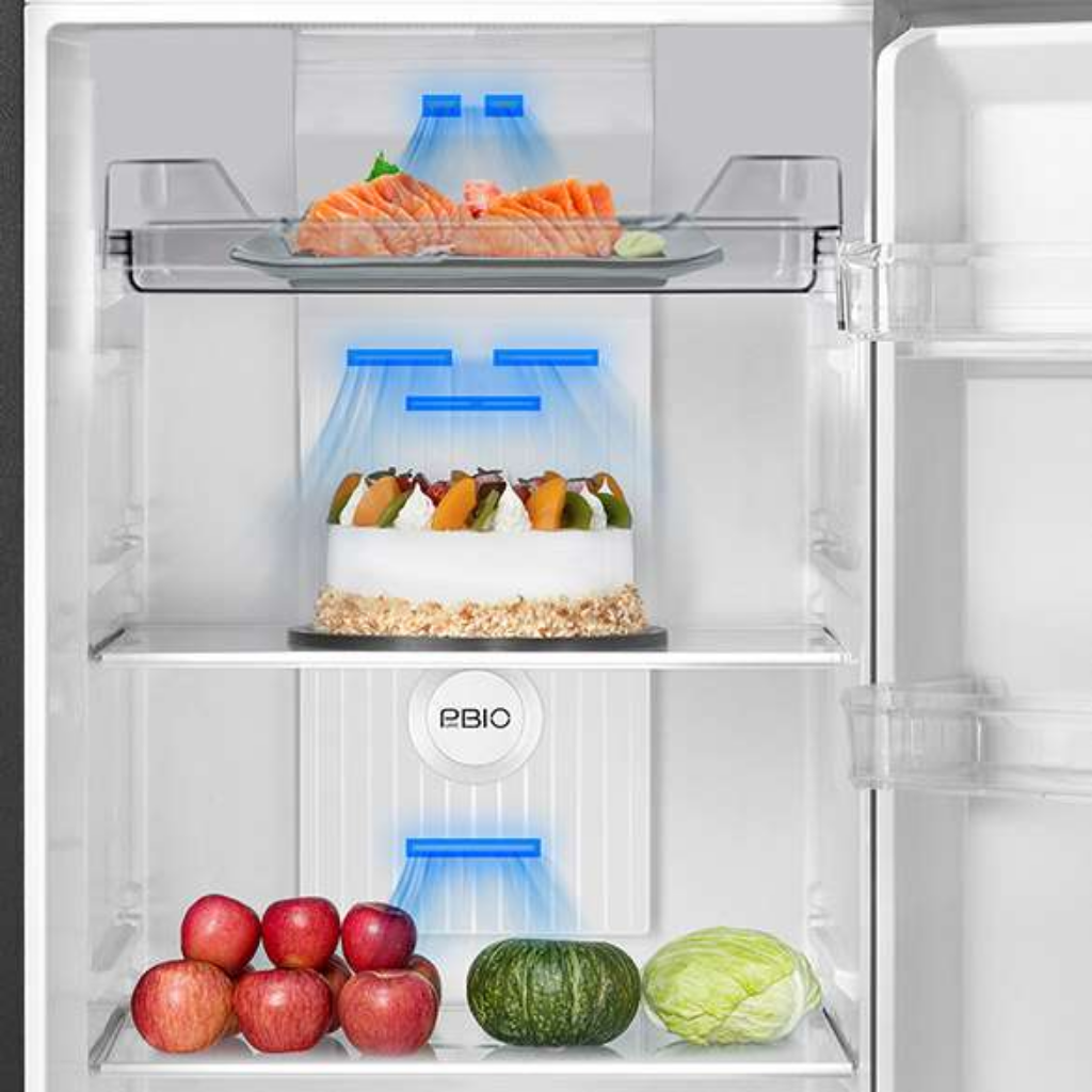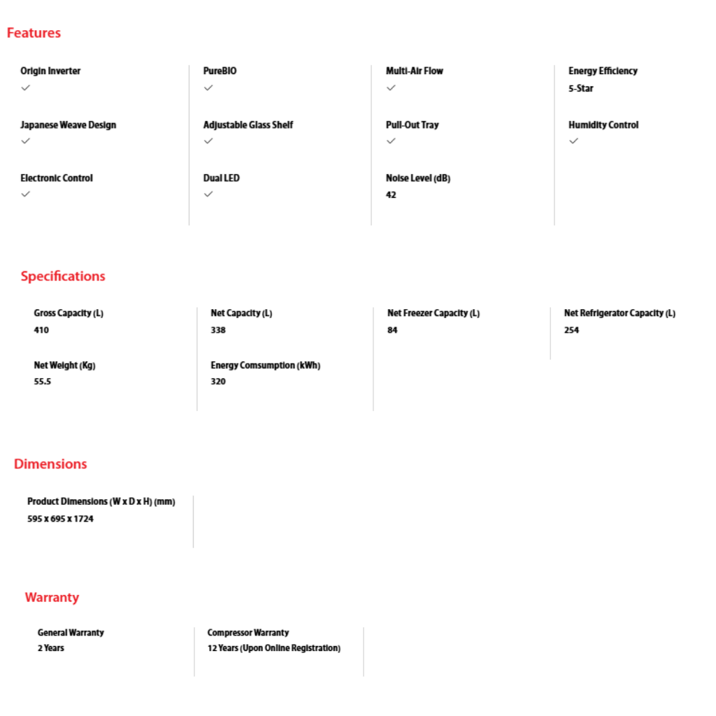 • Capacity: 410L Gross. • Features: Origin Inverter, AirFall Cooling. • Finish: Metal. • Warranty: 12 Years Compressor, 2 Years General Warranty.