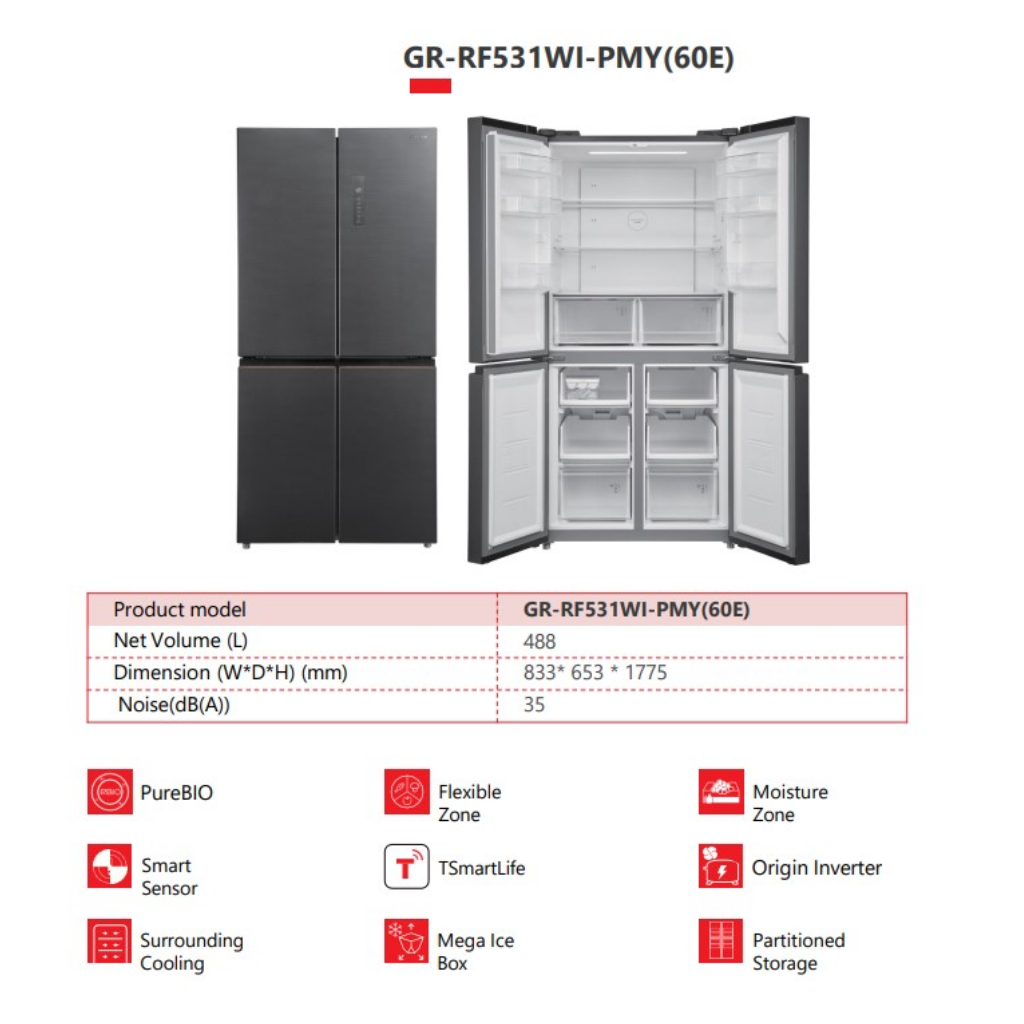 • Capacity: 530L Gross. • Features: Origin Inverter, IoT Enabled, Dual Cooling. • Finish: Dark Grey. • Warranty: 12 Years Compressor, 2 Years General Warranty.