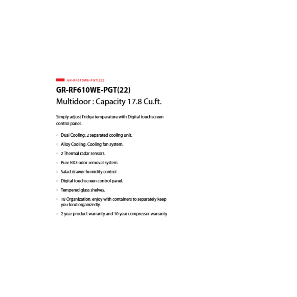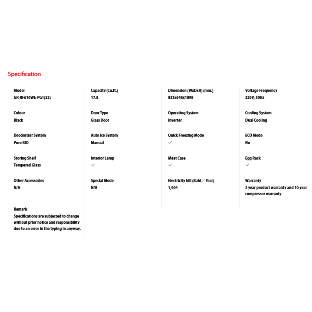 • Capacity: 556L Gross. • Features: Dual Inverter, AlloyCooling™, Plasma+ Pure. • Finish: Glass Black. • Warranty: 12 Years Compressor, 2 Years General Parts & Labour.