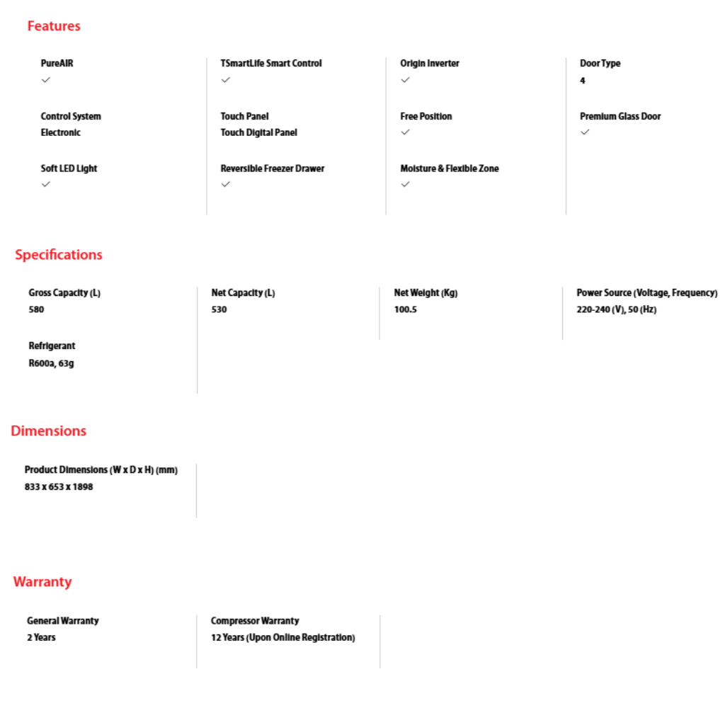 • Capacity: 580L Gross. • Features: Origin Inverter, PureAIR, IoT Smart Control. • Finish: Morandi Grey. • Warranty: 12 Years Compressor, 2 Years General Warranty.
