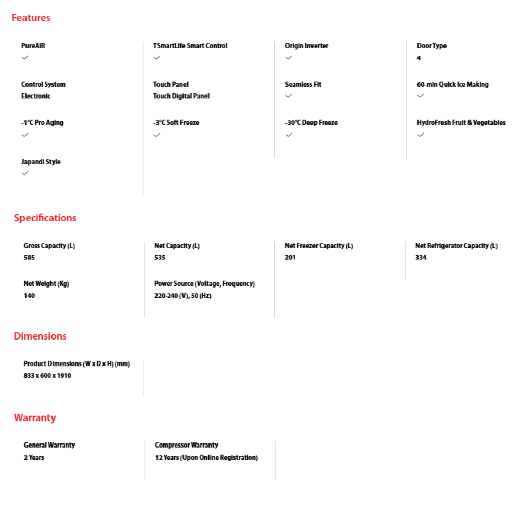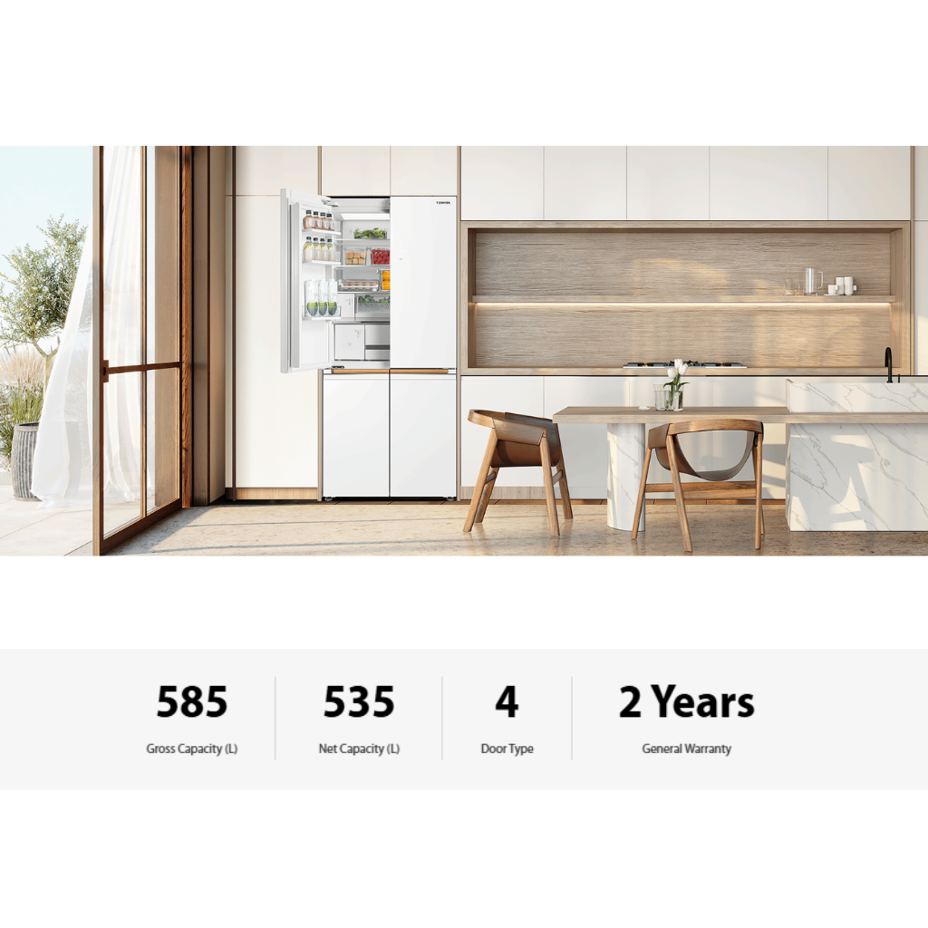 • Capacity: 585L Gross. • Features: Japandi Design, Origin Inverter, AIM Purifier. • Finish: Fuji White. • Warranty: 12 Years Compressor, 2 Years General Warranty.