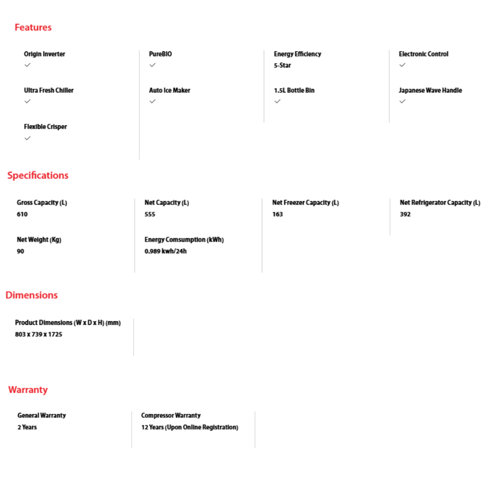 • Capacity: 610L Gross. • Features: Origin Inverter, PureBIO, AirFall Cooling. • Finish: Black Glass. • Warranty: 12 Years Compressor, 2 Years General Warranty.