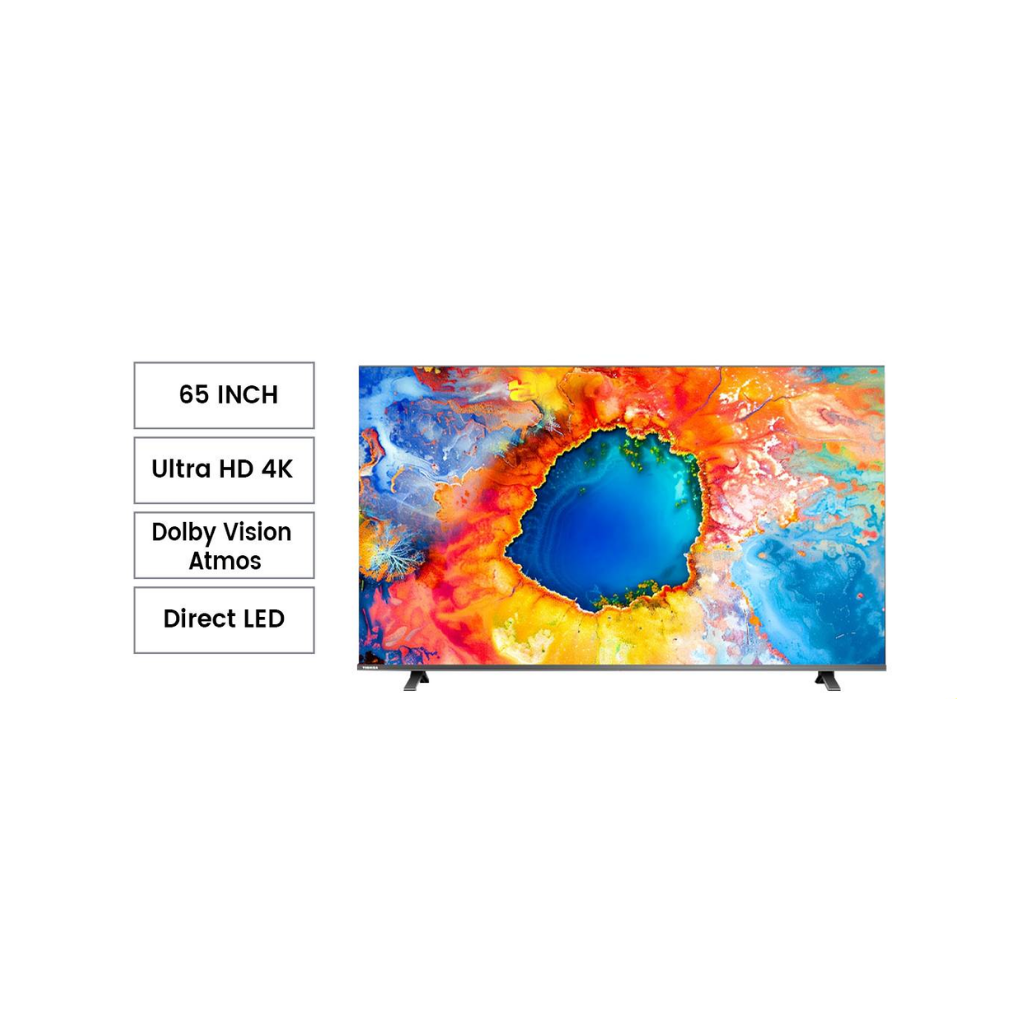 • Screen: 65-inch 4K QLED. • OS: VIDAA Smart TV. • Features: Quantum Dot Colour, Dolby Vision. • Warranty: 2 Years General Warranty.