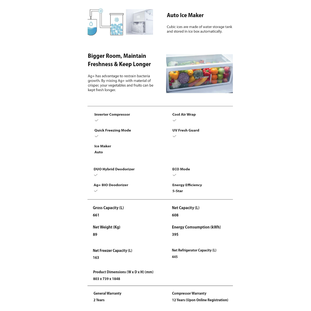 • Capacity: 661L. • Features: Duo-Hybrid Inverter. • Finish: Black Glass. • Warranty: 12 Years Compressor, 2 Years General Parts & Labour.