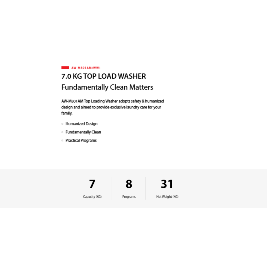 TOSHIBA 7.0KG TOP LOAD WASHER AW-M801AM(WW)