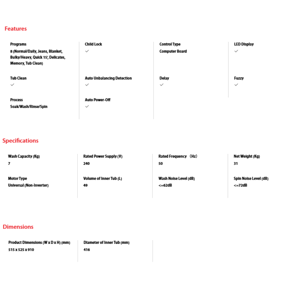 • Capacity: 7.0kg. • Features: GreatWaves™ Technology, No Angular Design. • Color: White. • Warranty: 5 Years Motor, 2 Years General Warranty.