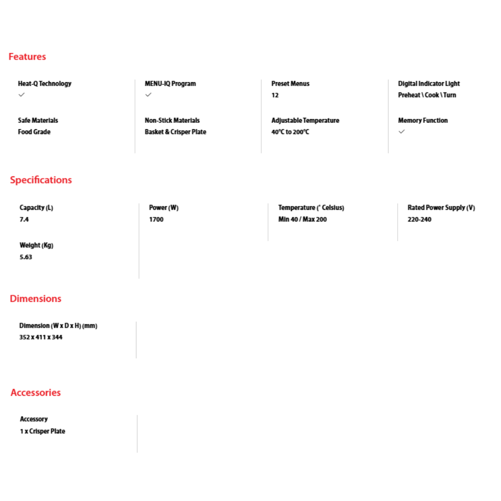 • Capacity: 7.4L. • Features: Smart Digital Control, 12 Preset Menus. • Warranty: 1 Year General Warranty.