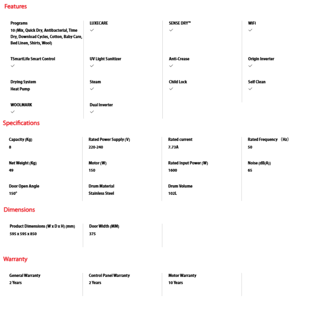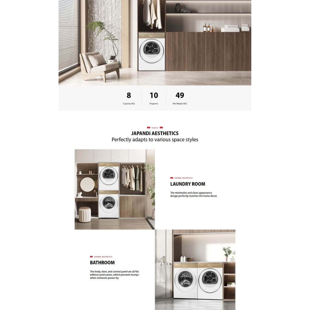 • Capacity: 8.0kg. • Features: Heat Pump, Japandi Style. • Finish: White. • Warranty: 12 Years Motor, 2 Years General Parts & Labour.