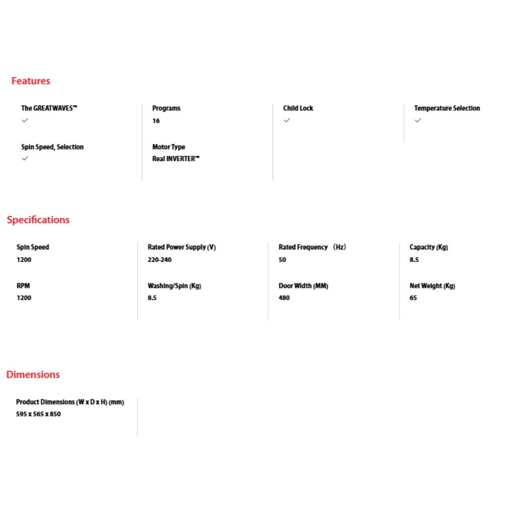 • Capacity: 8.5kg. • Features: Real Inverter, GreatWaves™, CycloneMix. • Color: Dark Grey. • Warranty: 12 Years Motor, 2 Years General Warranty.