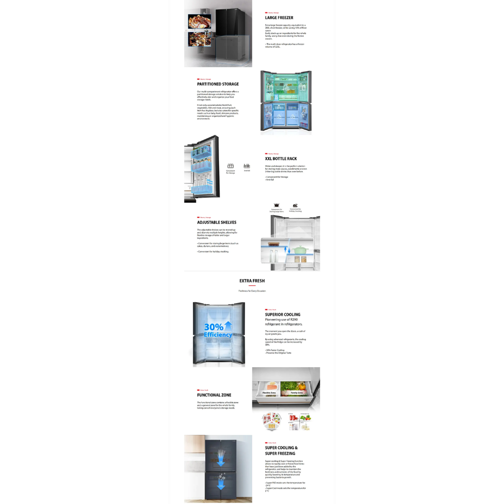 • Capacity: 820L Gross. • Features: Origin Inverter, Smart Control. • Finish: Morandi Grey. • Warranty: 12 Years Compressor, 2 Years General Warranty.